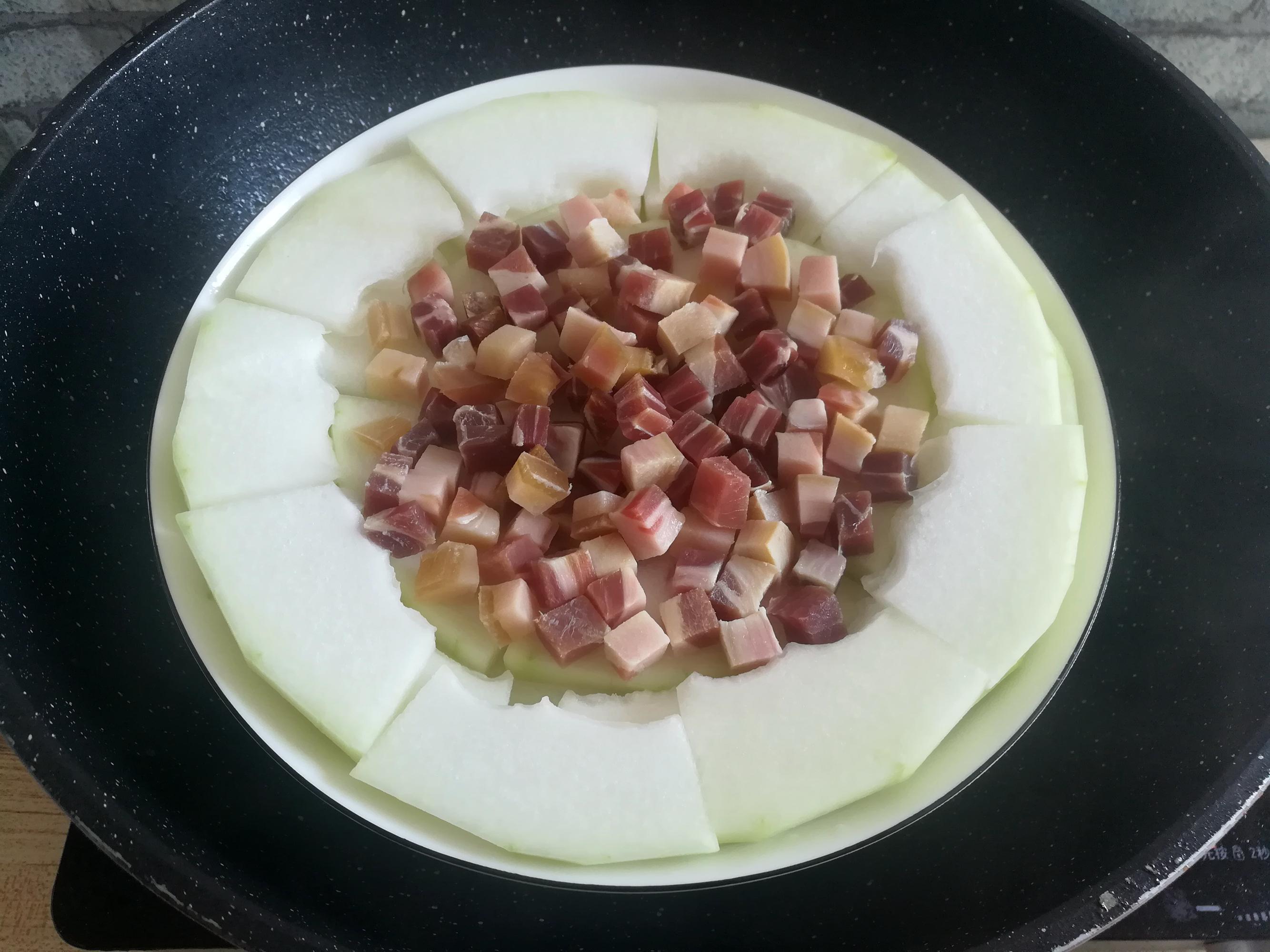3.燒一鍋熱開水,放入裝有冬瓜和火腿肉的盤子裏,大火隔水蒸10分鐘左右。具體蒸的時間根據冬瓜的厚度和火力的大小靈活調整。