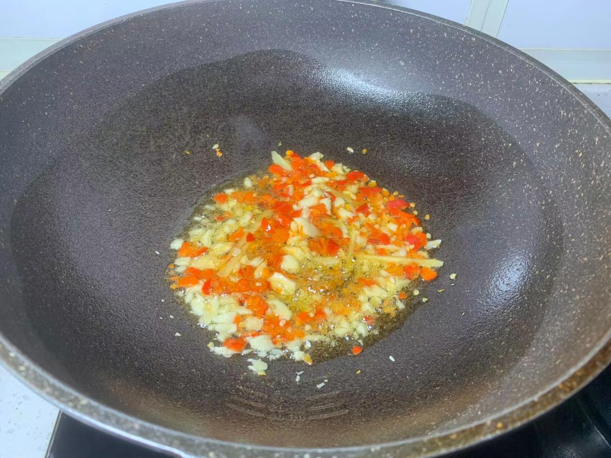 3、準備一頭大蒜,去皮後切掉根蒂,剁成蒜粒,適量紅辣椒洗乾淨也剁碎。起鍋燒油,把蒜末、紅椒碎和薑絲放入油鍋內,中小火炒出香辣味。
