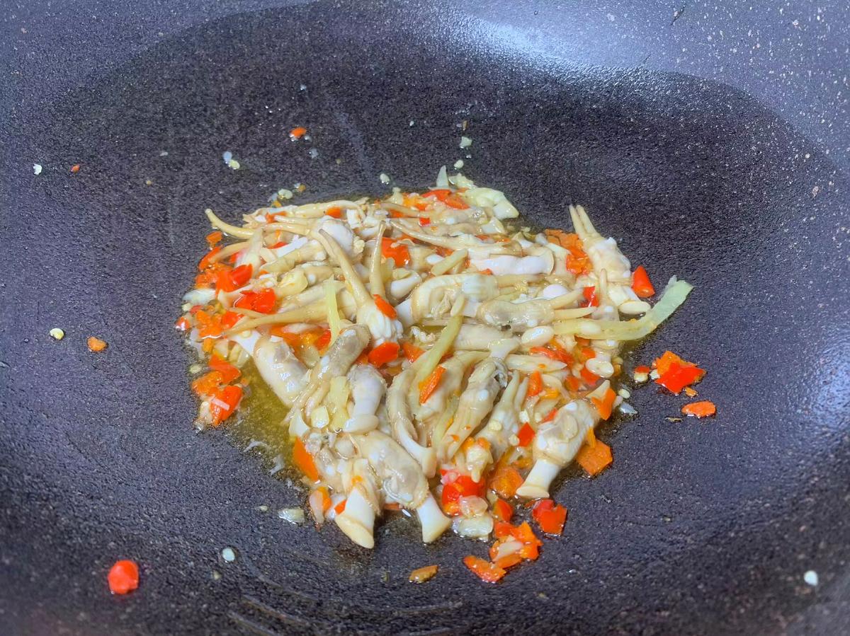 4、剁椒炒好後,往鍋中倒入1勺蠔油、少許味極鮮、少許鹽翻拌一下,隨後把蟶子肉倒入鍋中,大火翻炒10秒左右,把蟶子肉炒至入味。