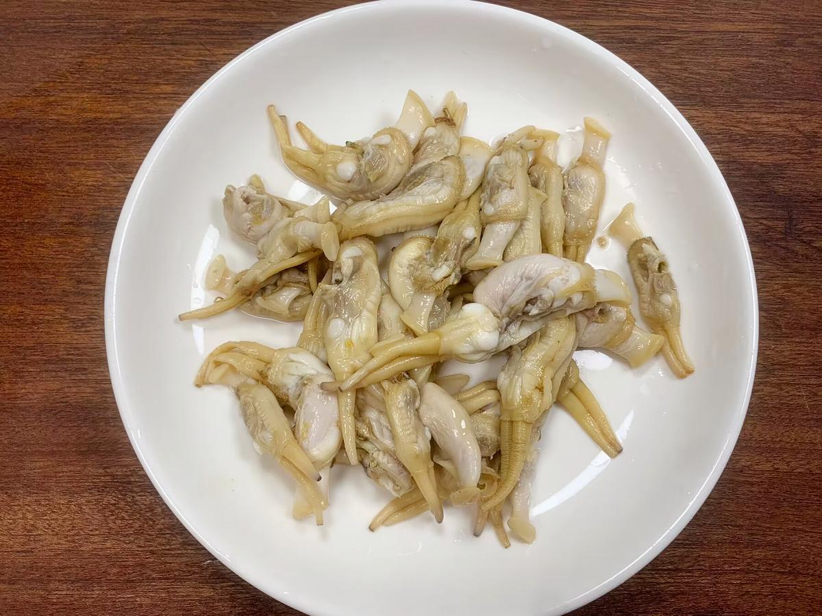 2、接下來把脫殼的蟶子揪出它的內臟,處理乾淨以後多清洗幾遍,攥幹水分備用。