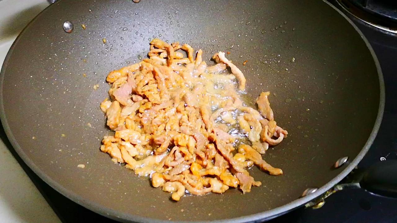 3.起鍋加油,油熱後先放入豬肉絲滑炒,將豬肉絲炒散,炒至肉絲變色以後關火,把炒好的肉絲盛出裝盤備用。