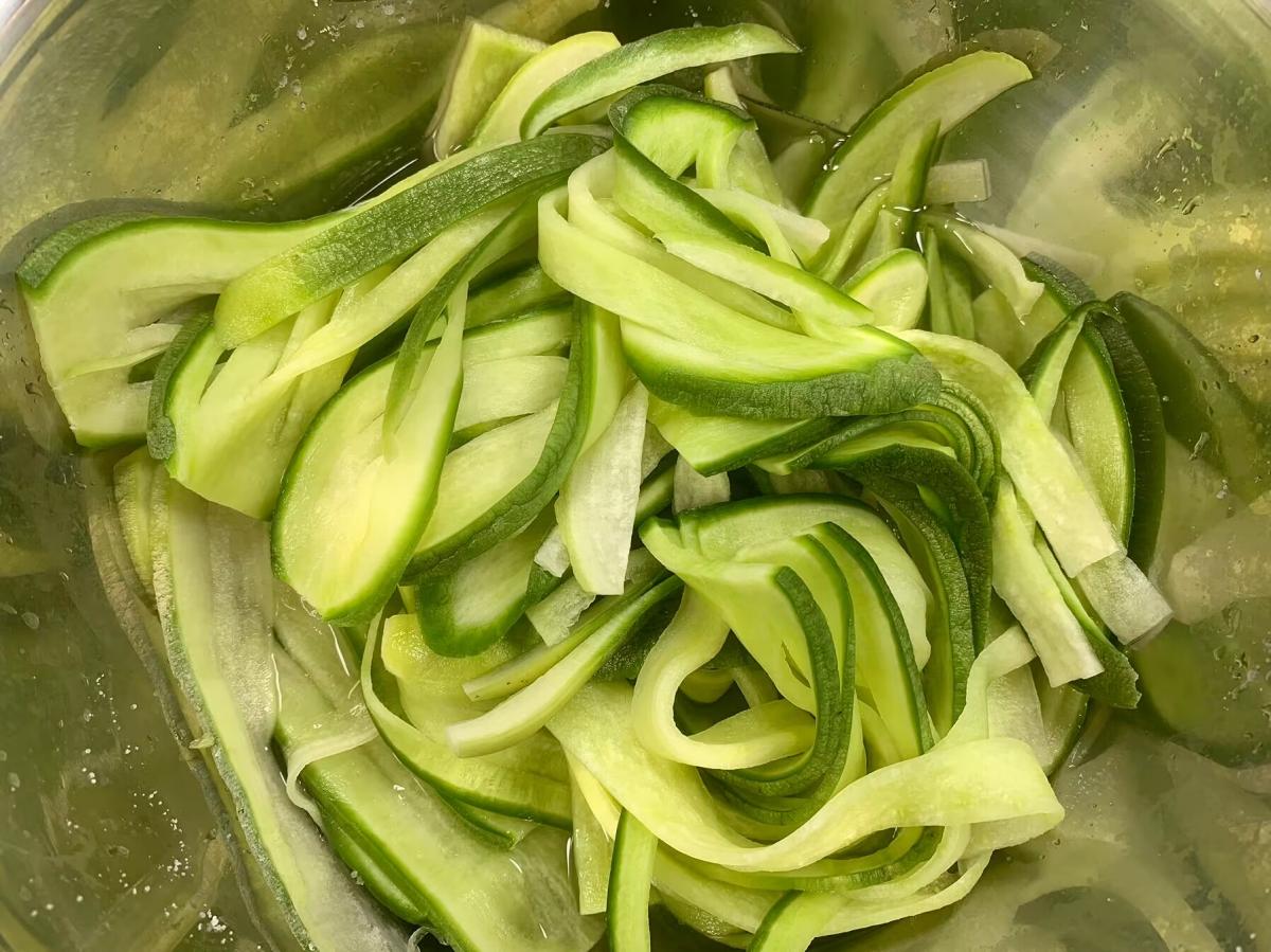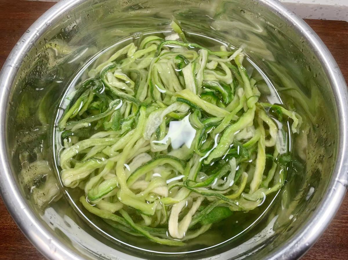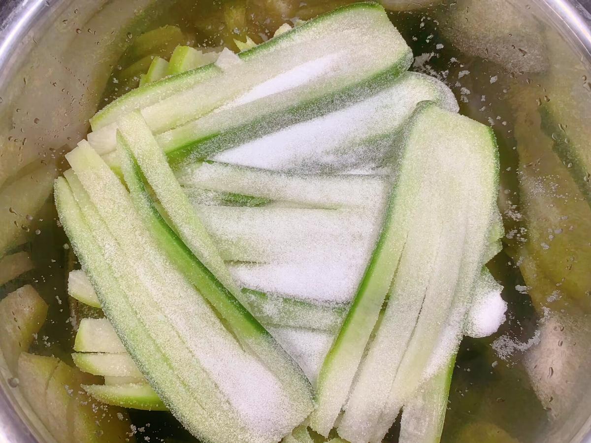 3、青蘿蔔內多餘的水分已經完全醃出來,雙手戴一次性手套,取適量的青蘿蔔片,雙手使勁的攥出裏面的水分,一定要攥幹水分,這樣在曬的過程中可以節省不少時間。