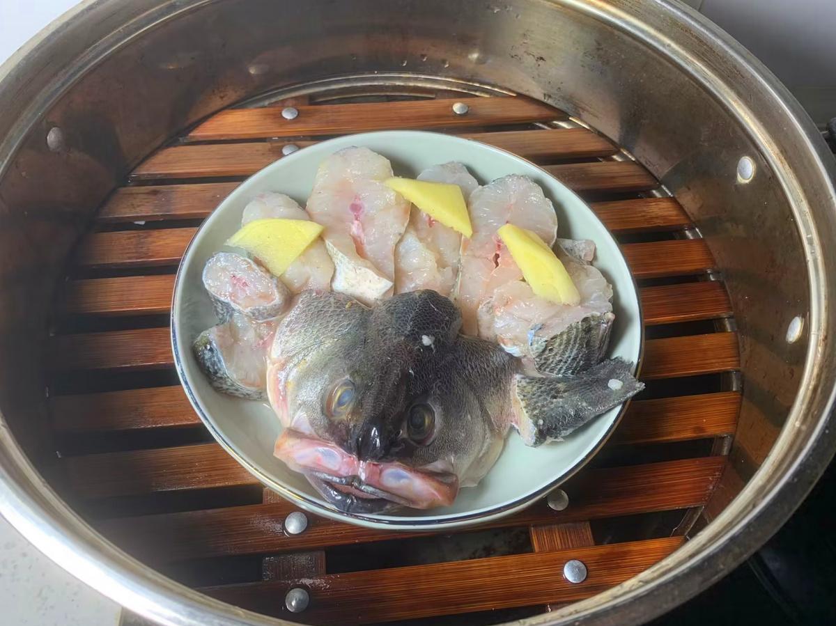 2、魚肉塊擺放在盤中,放幾片薑片,造型隨意,怎麼好看怎麼擺,放入鍋中,蓋上鍋蓋,大火燒開後繼續蒸8分鐘(記住不要蒸的時間過長,避免把魚肉蒸老,那就非常影響口感了)!