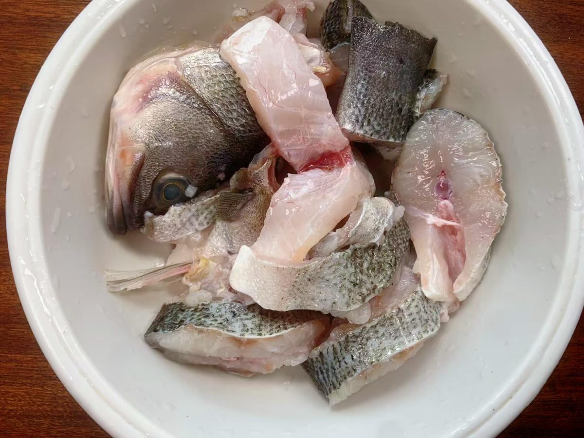 具體做法:1、 準備一條鱸魚,買的時候讓賣魚大哥給去除魚鱗和內臟,並清理乾淨,回家做魚就方便了。處理好的鱸魚用流動的水沖洗乾淨裏面的血水,然後剁成小塊,魚頭不要扔掉,把剁好的魚塊放入盆內,撒上適量胡椒粉、1少料酒、薑片,攪拌均勻醃10分鐘,可以讓魚肉更加入味。