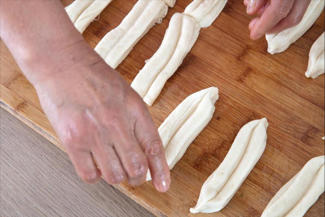 4、第二天拿出來以後,這個麪糰千萬別再揉了,直接放到案板上就可以啦。用擀麪杖擀成薄薄的劑子,整體是長方形的哈,然後切成一段一段的,把兩段重疊到一起,中間壓一根筷子,用力按壓,使其定型、粘連。