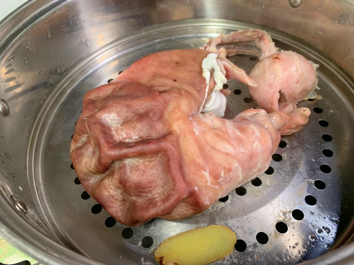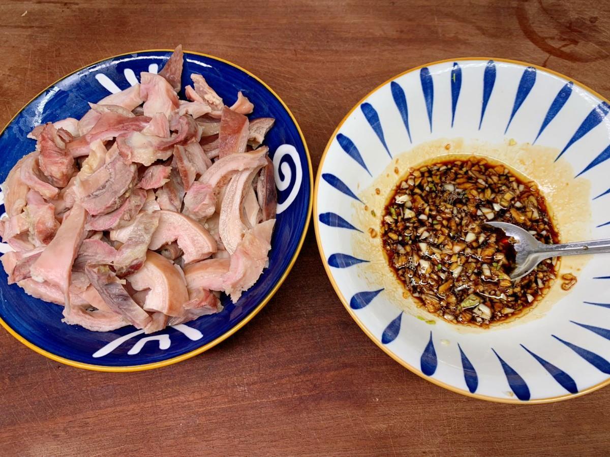 豬肚洗乾淨後我喜歡直接上鍋清蒸,把豬肚放進籠屜中,放上幾片薑片去腥,然後涼水上鍋,大火蒸半個小時左右。具體時間要根據豬肚的大小來定,最後用筷子插一下,能夠輕鬆插進去豬肚就是熟透了。這裏要注意豬肚也不要蒸太長時間,以免蒸過火,把肉蒸老了,口感也不好。蒸熟後的豬肚切成條,我切得比較粗,我覺得自己在家喫還是大塊些比較過癮,大家覺得呢?然後再準備搗好的蒜泥,加上生抽、蠔油和香油拌勻,蘸着喫,太美味了,香辣又下飯。