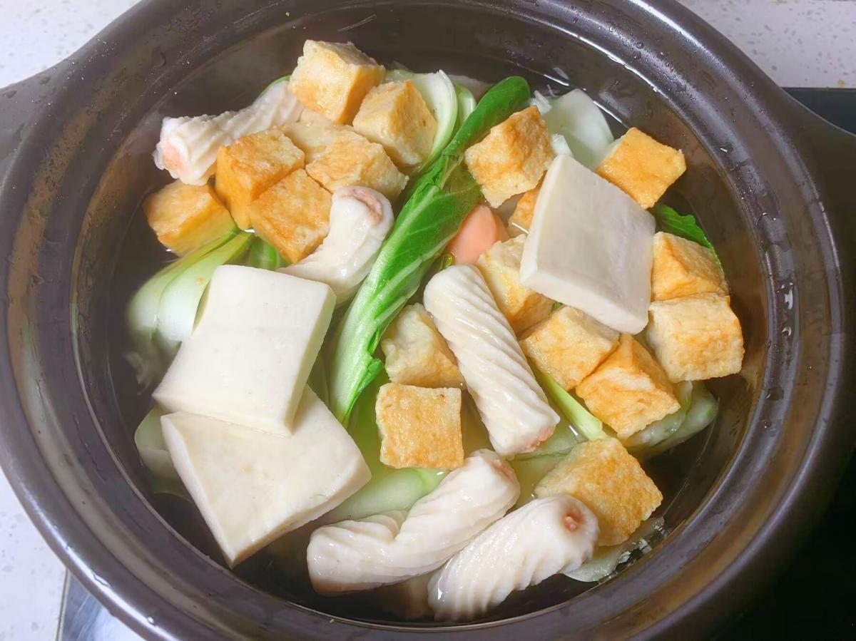 3、接下來準備一些自己平時喜歡喫的青菜、魚蝦、肉丸類,清洗乾淨後放入砂鍋內,倒入適量清水,大火煮沸騰後,轉小火慢煮。