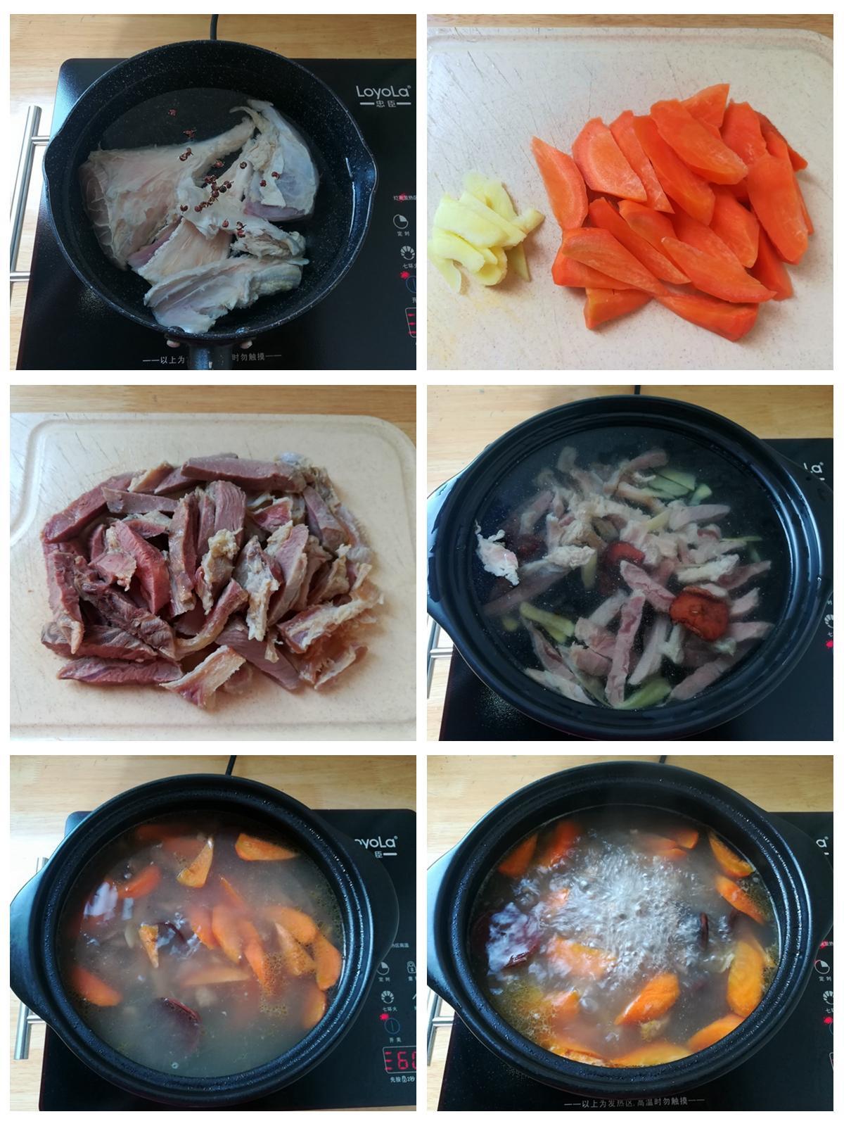 3.羊肉切成長條,放入砂鍋中,加入薑片和山楂片大火煮開再煮半個小時。