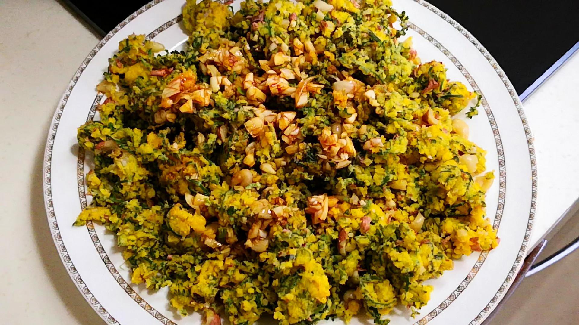 1.薺菜摘洗乾淨後備用;取一把花生米碾成花生碎備用;