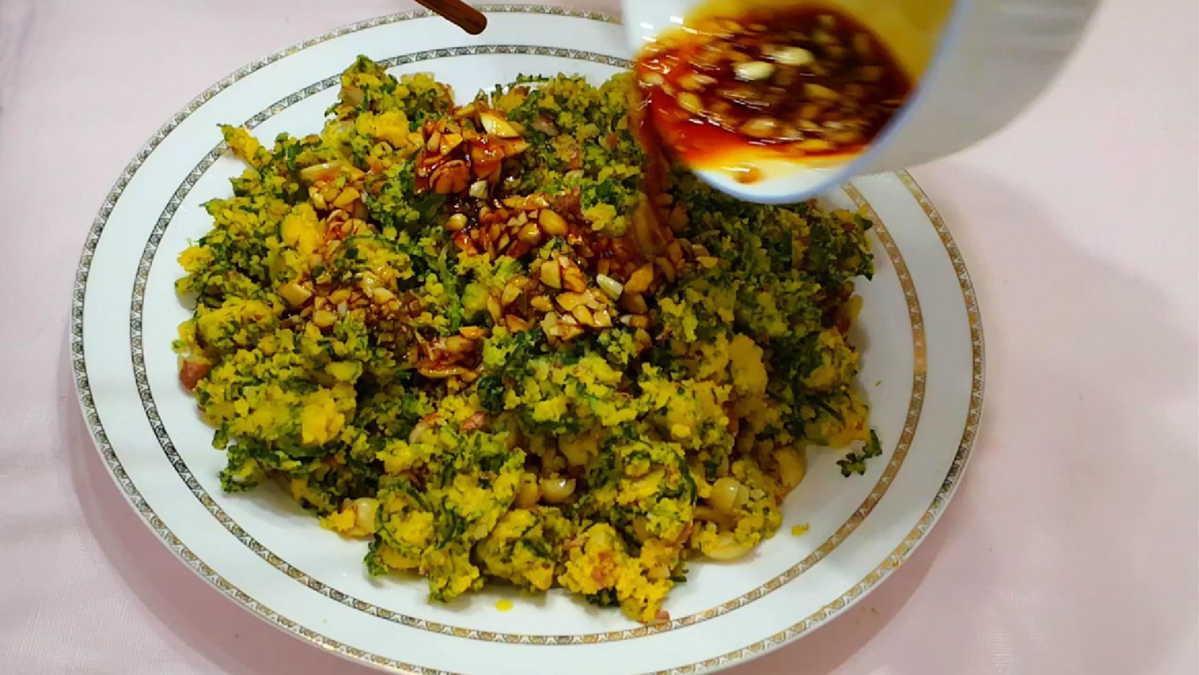 5.蒸好的薺菜上再均勻地澆上我們調好的料汁,就可以美美地開喫了,特好喫!