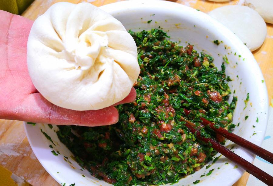 5.面發好後,取出麪糰繼續在案板上揉搓一會兒,然後搓成長條,揪成大小均勻的劑子,擀成中間厚四周薄的麪皮。把調好的薺菜餡放到麪皮中間包起來,按自己喜歡擅長的手法即可。