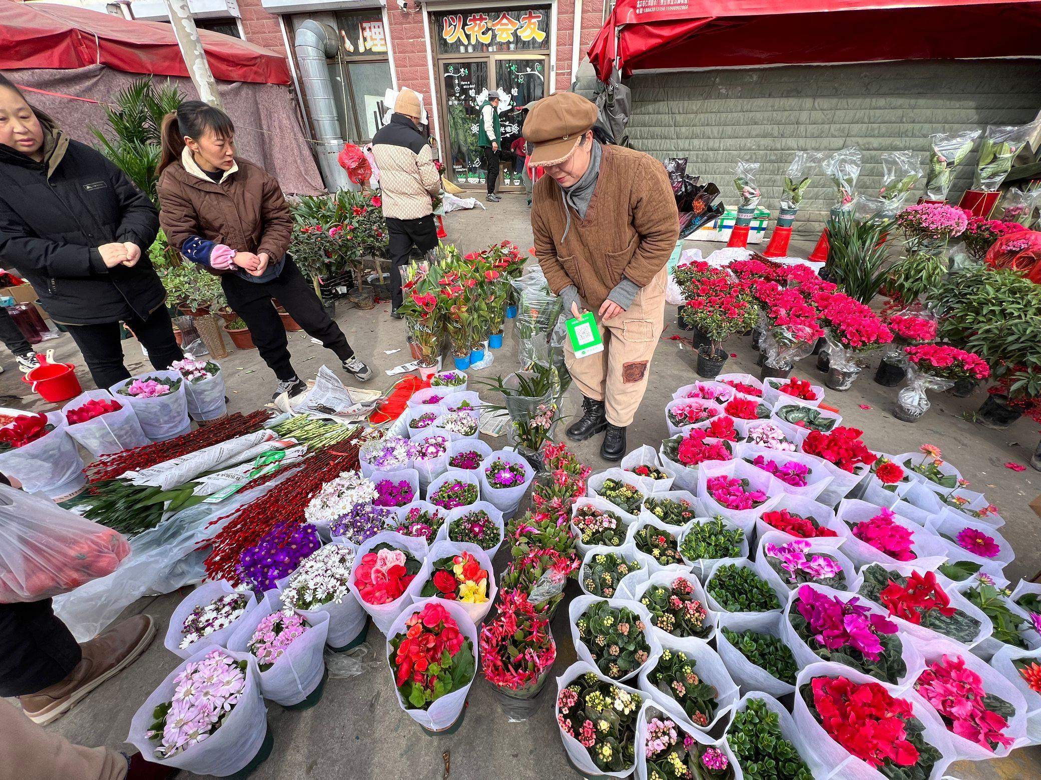 集市上賣迎春花的還真不少呢,這位爸爸扛着兒子,一家三口其樂融融,臘月裏趕大集要的就是一個氛圍感,不管買啥東西,主打的就是一個高興。