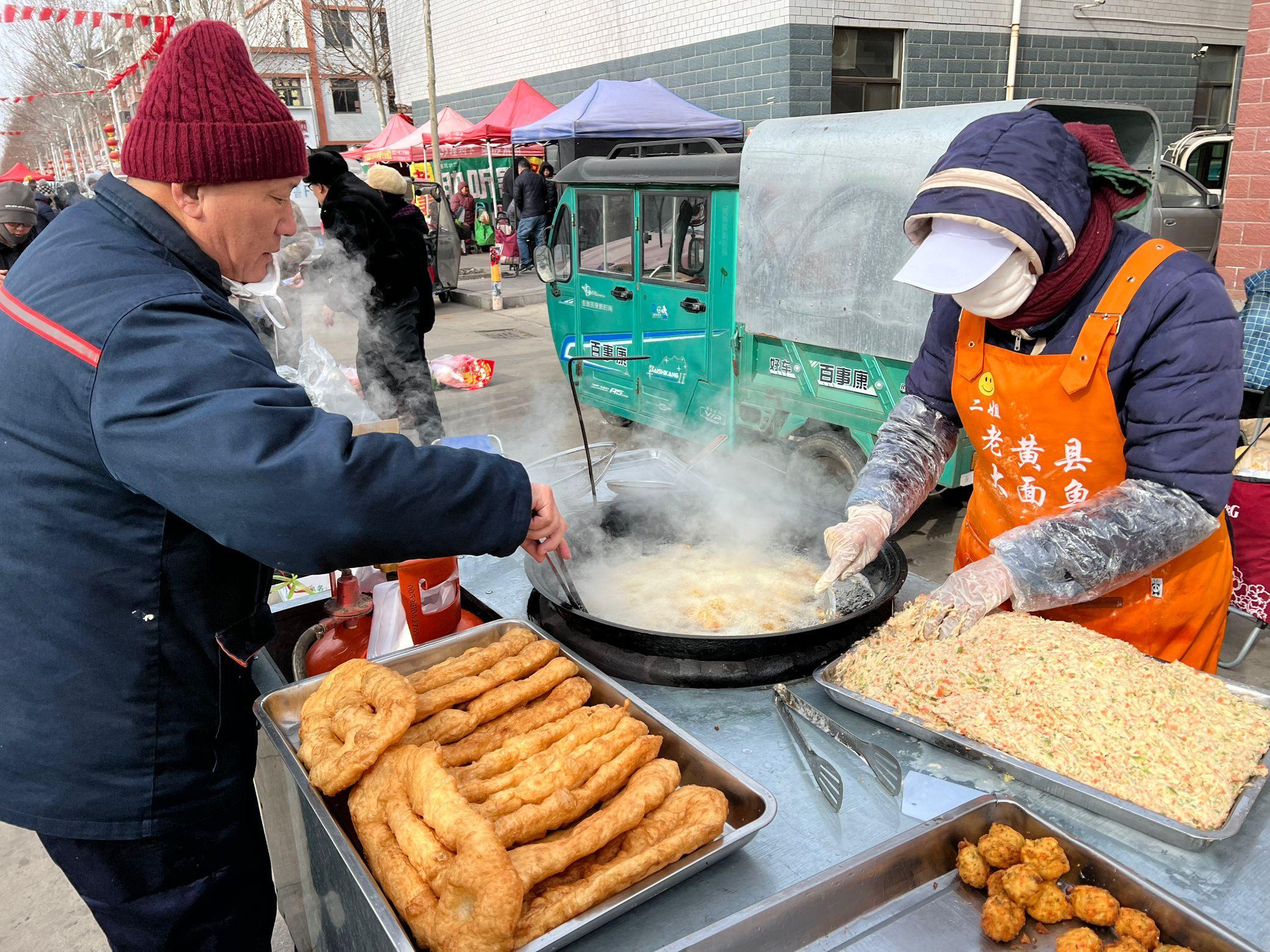 逛了一上午的大集,肚子咕嚕嚕地叫,遠遠就聞到了香噴噴的大面魚和炸丸子,在我們當地麪食也是一大特色,很多年輕人不愛做飯,中午就買個油餅喫,蘿蔔丸子也可以買一些,正月裏擺盤也是一道特色菜。自己在家炸太費油了,這用的都是純正的花生油,看起來就乾淨衛生。
