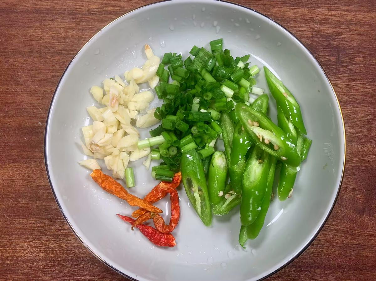 2、接下來準備一些配菜,可根據自己的口味來放,像芹菜、蒜薹都可以,家人比較喜歡喫辣,我就以青線椒和辣椒爲主,這樣喫着才過癮。把青線椒切成長段,紅辣椒準備3-5個,大蒜剁成蒜粒,香蔥切段,都裝盤備用。