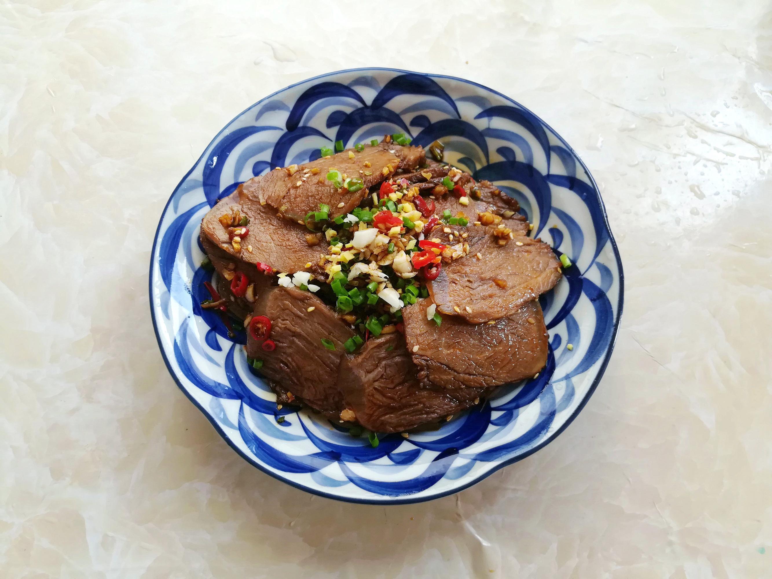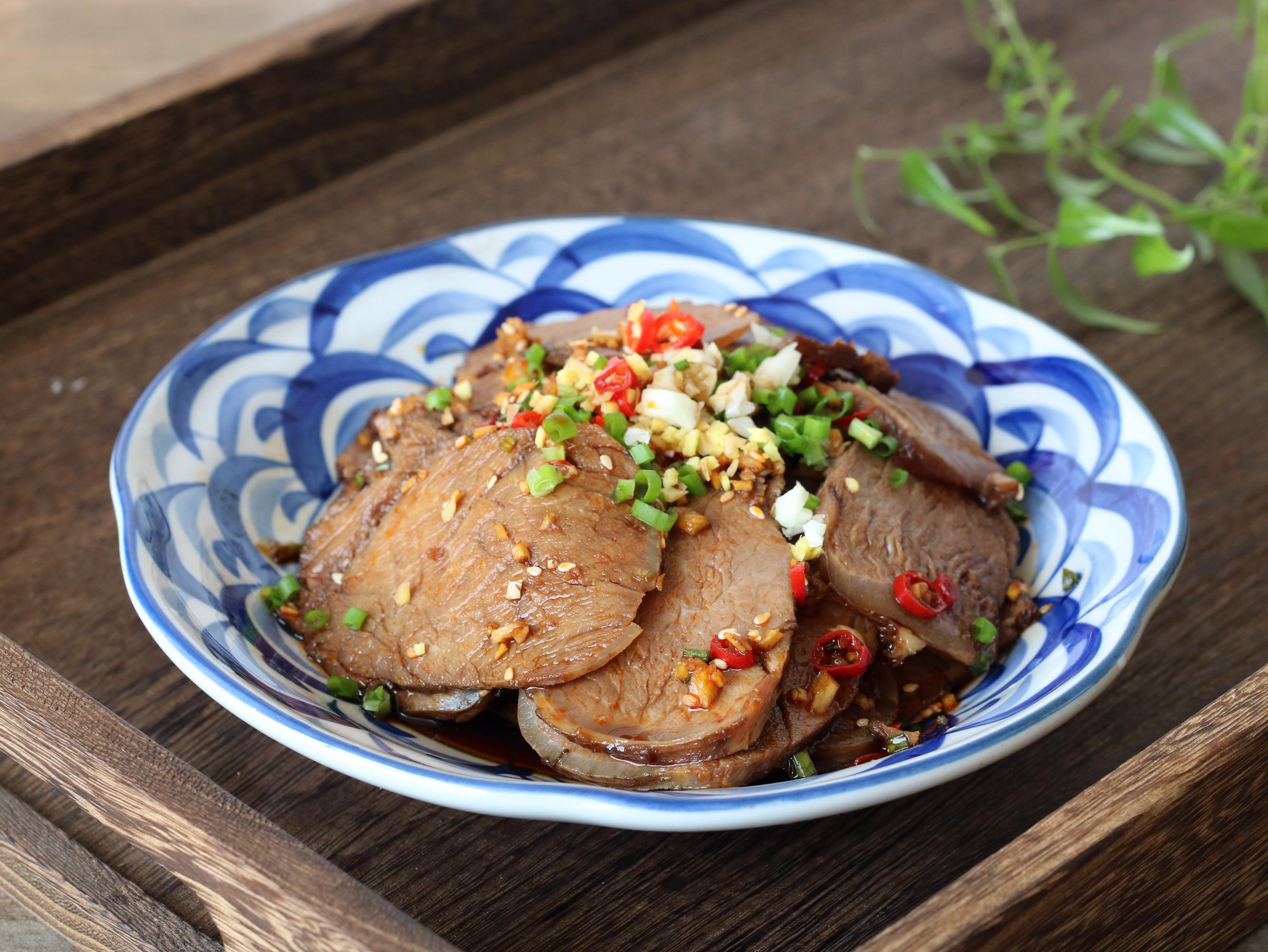 做年夜飯的時候,把牛腱子肉切成薄片,再用生薑、大蒜切碎,加上辣椒和生抽做一個調味碟淋在上面拌勻,撒上蔥花就可以端上桌了。