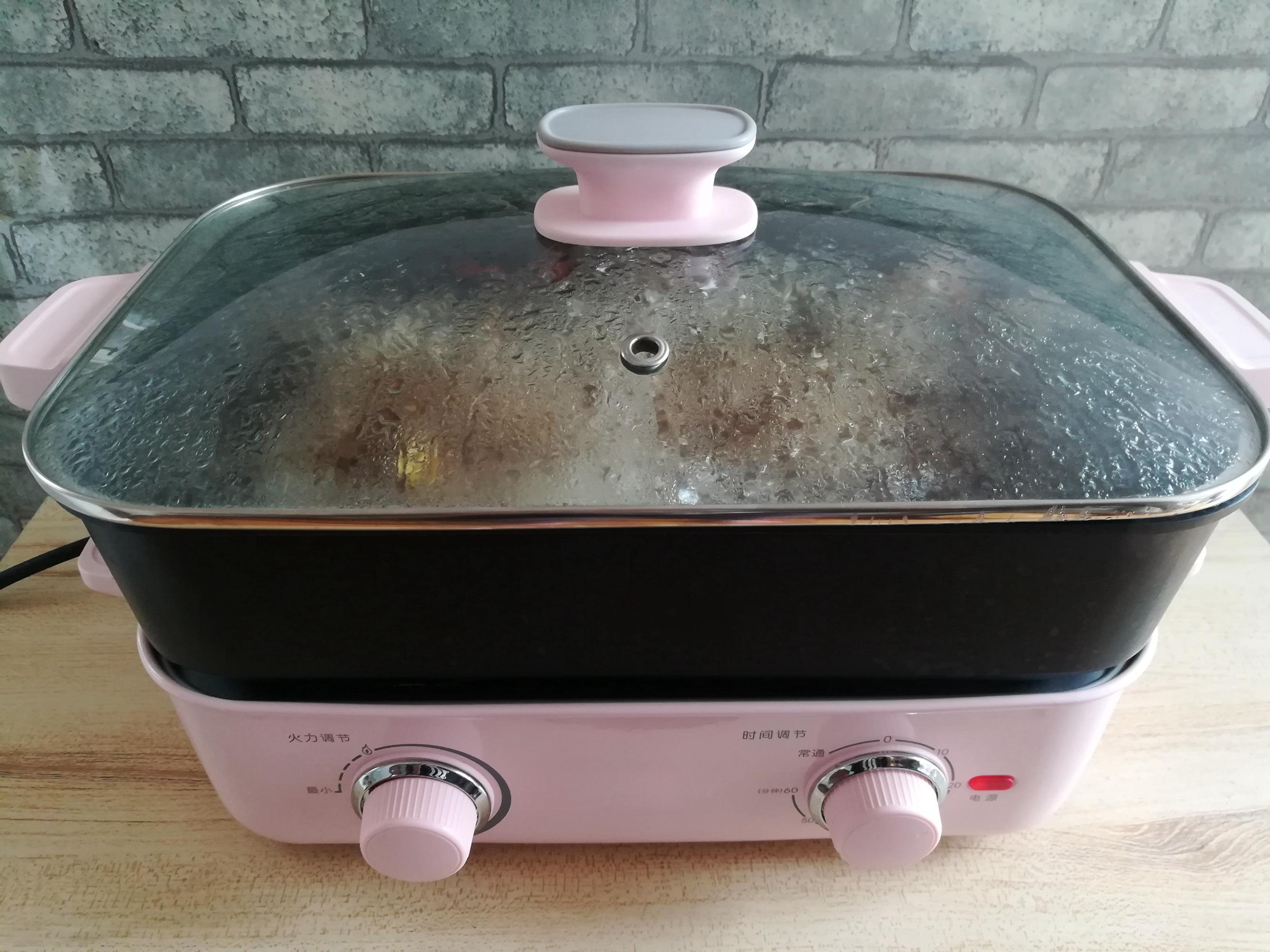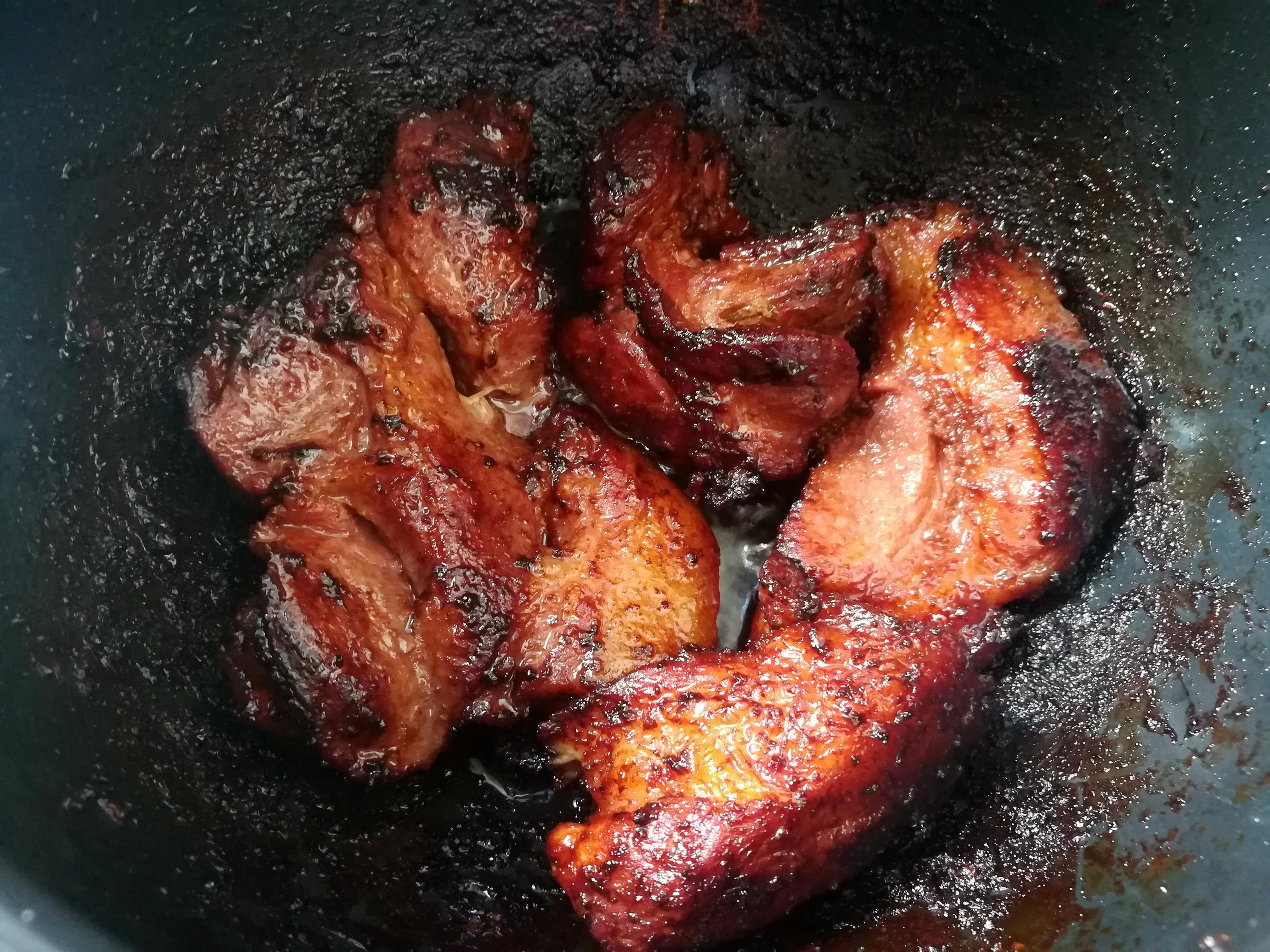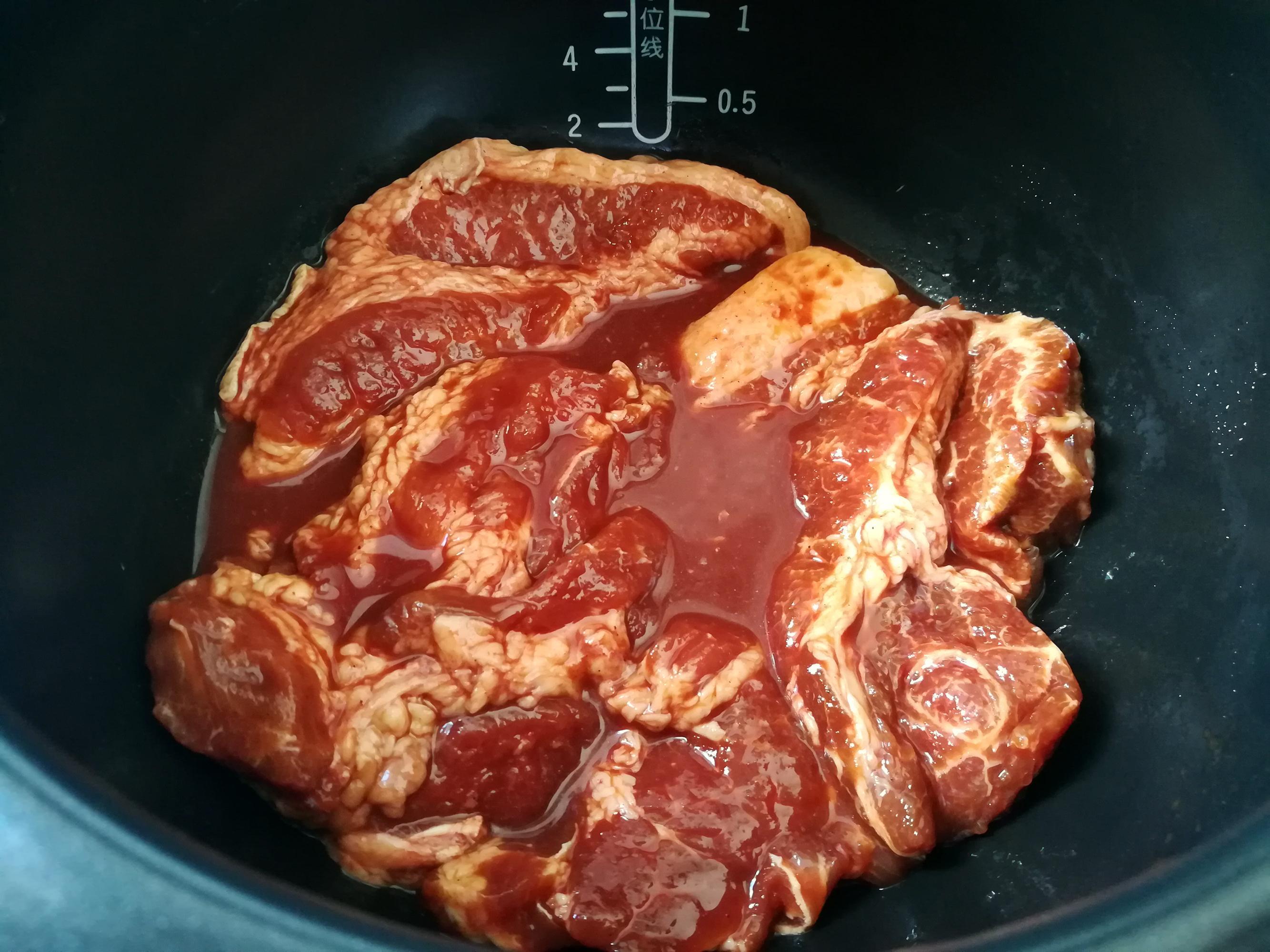 3.把醃好的梅花肉放入電飯鍋中,把醃肉的汁水也一起倒進去,選擇電飯鍋的煮飯程序,按下開始鍵。