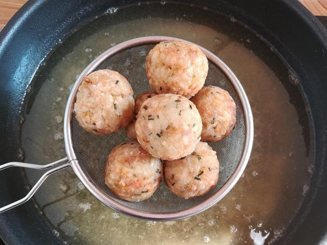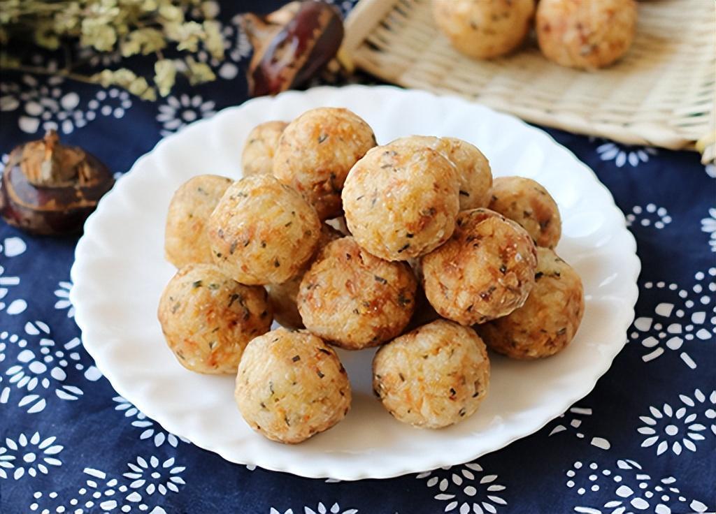【糯米豬肉丸子——團團圓圓】外觀焦黃,圓圓的丸子,寓意着一家人團團圓圓,它既是菜又是一道小點心。