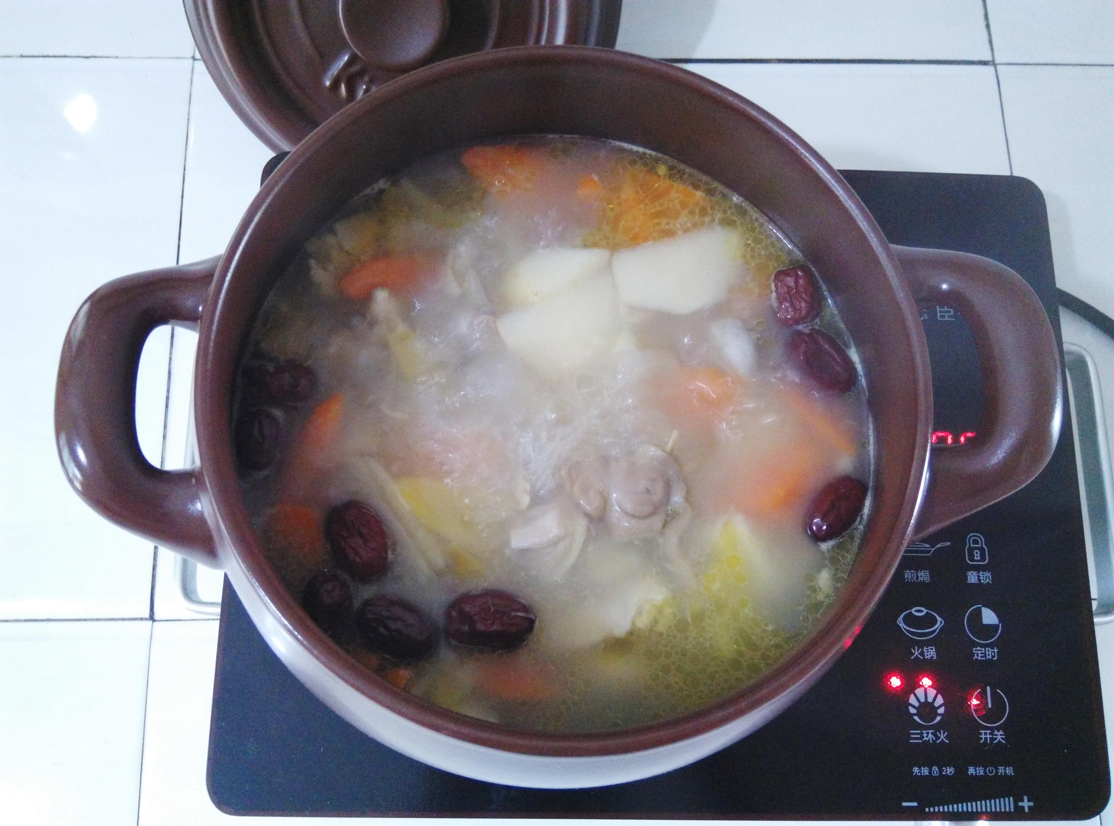 3.焯過水的雞肉放入砂鍋裏,加入薑絲和紅棗,大火煮開轉中火煮20分鐘。