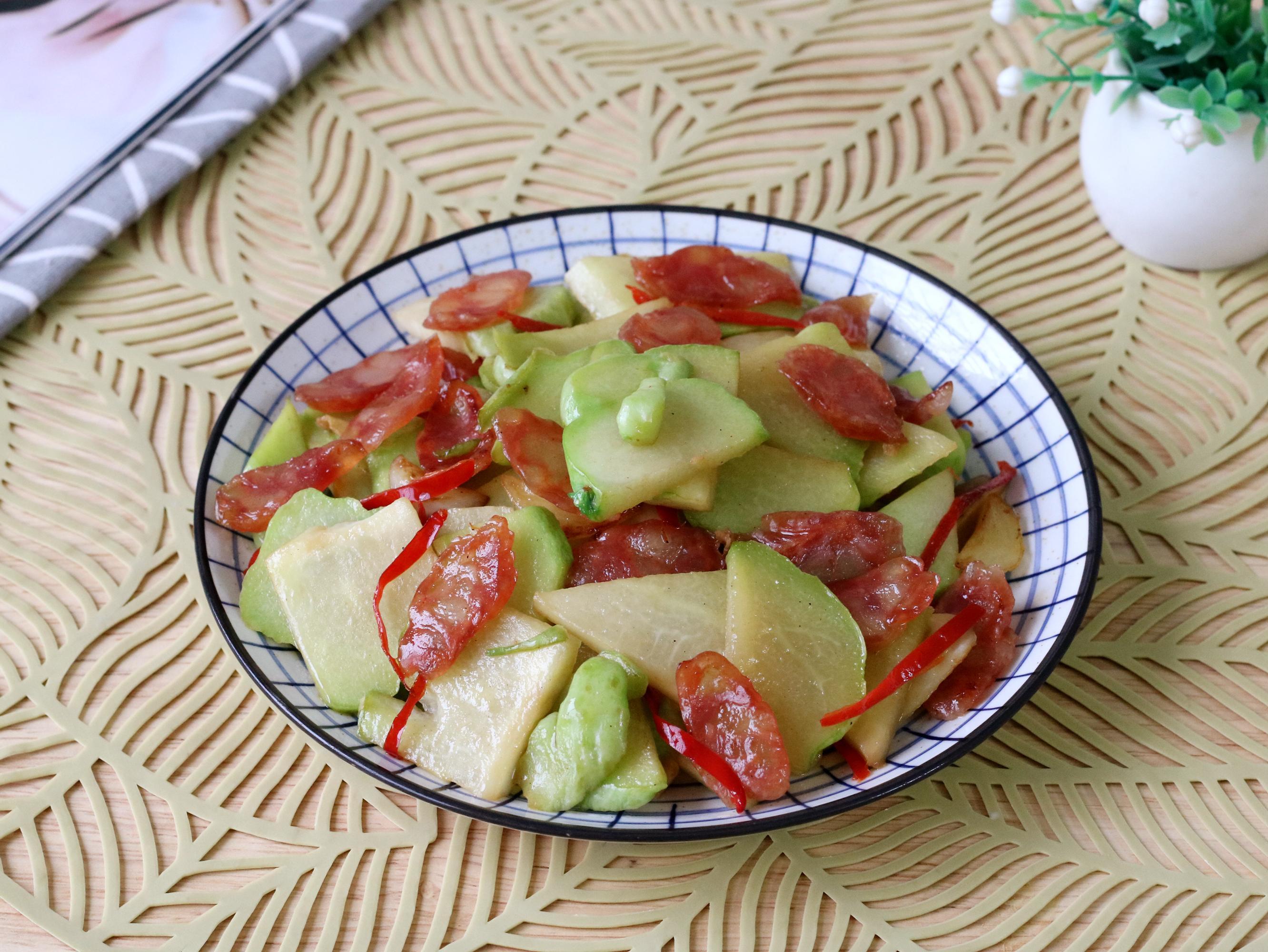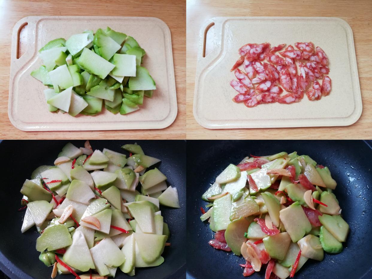 食材:佛手瓜、廣式臘腸、生薑、大蒜、辣椒、食用油、老抽、鹽