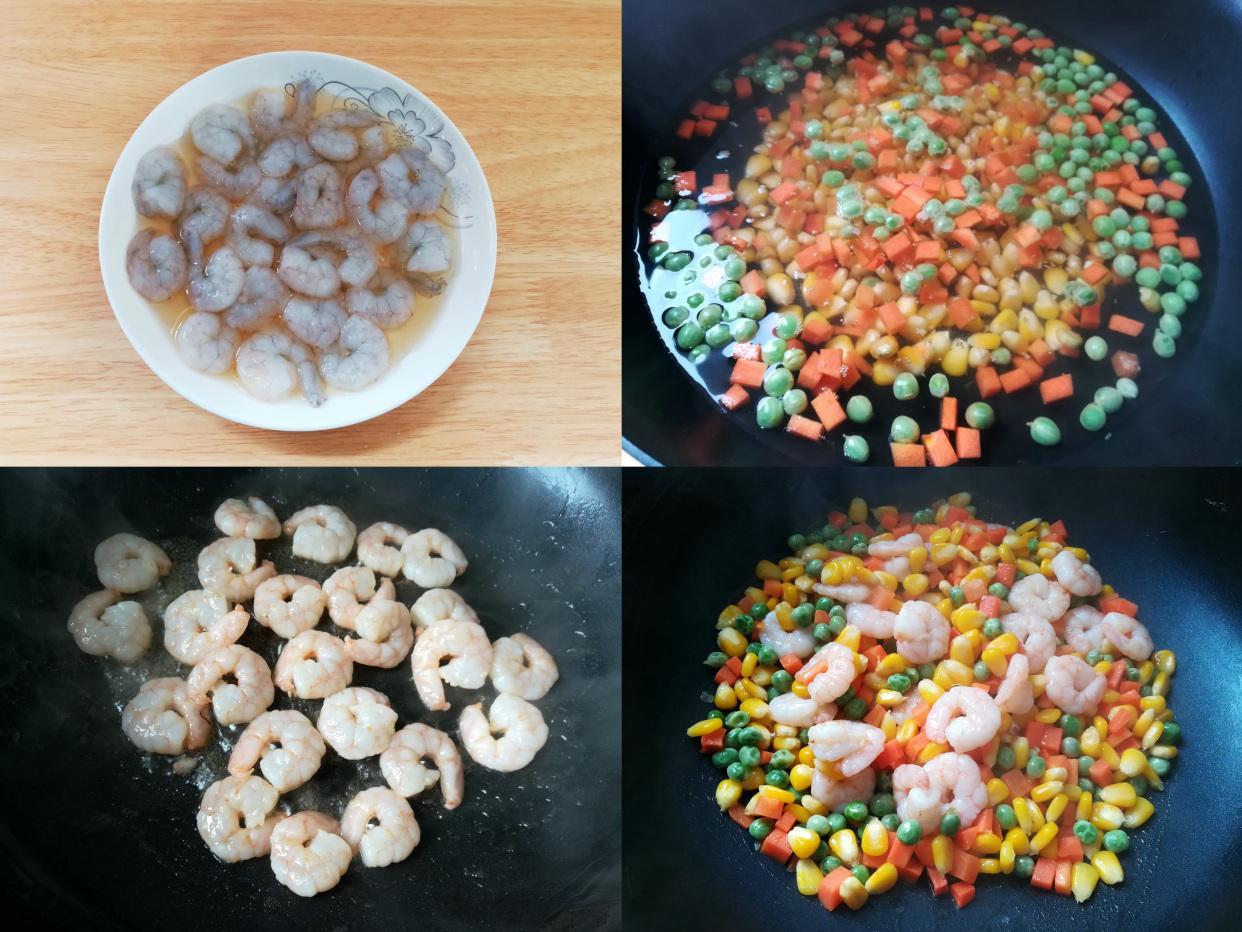 4.鍋裏重新放油,放入胡蘿蔔丁、玉米和豌豆炒到熟透,加入蝦仁翻炒均勻,加鹽調味。