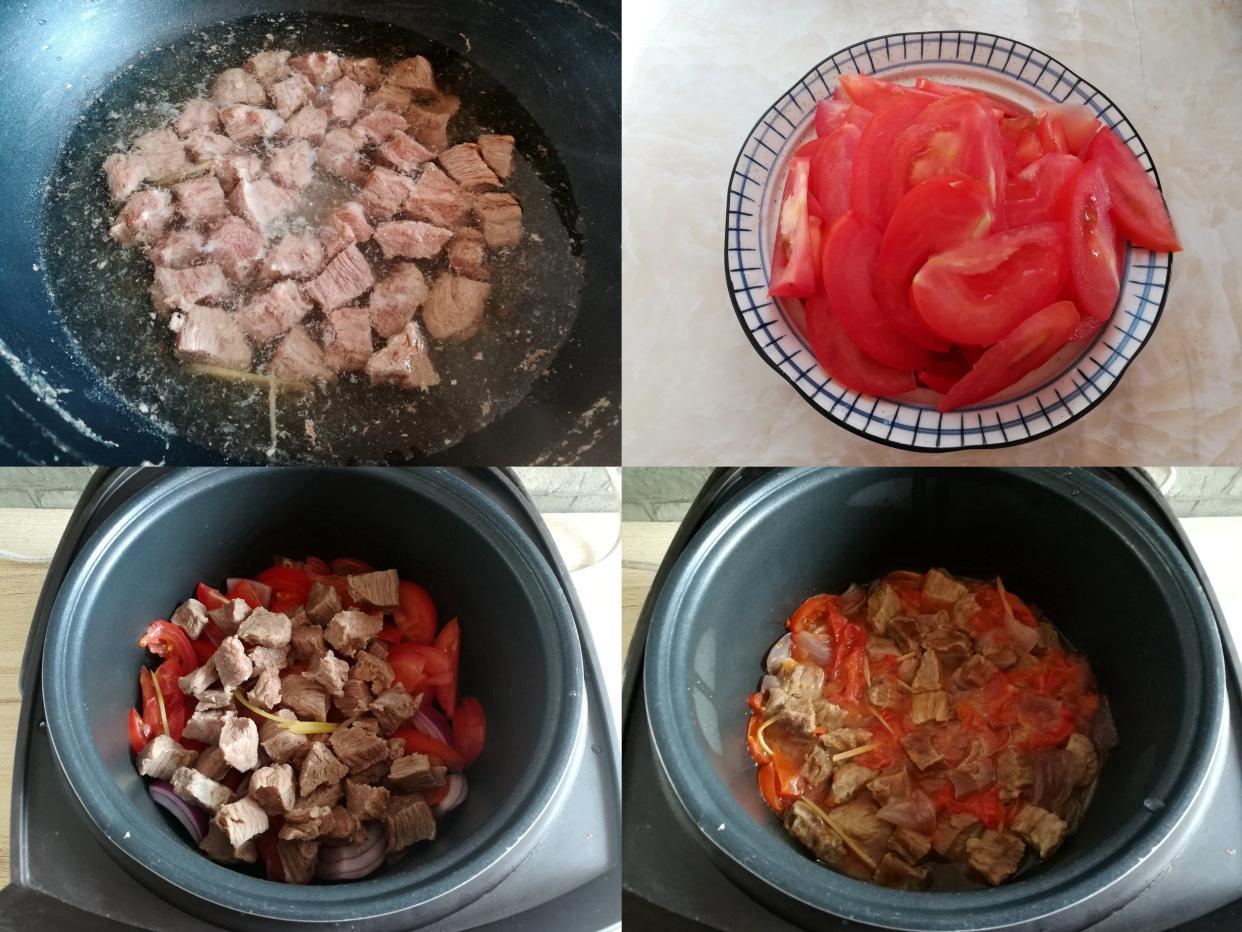 3.電飯鍋加熱放油,放入洋蔥炒出香味,加入西紅柿和牛肉,不需要加水,按下煮飯程序,煮好後加鹽調味。