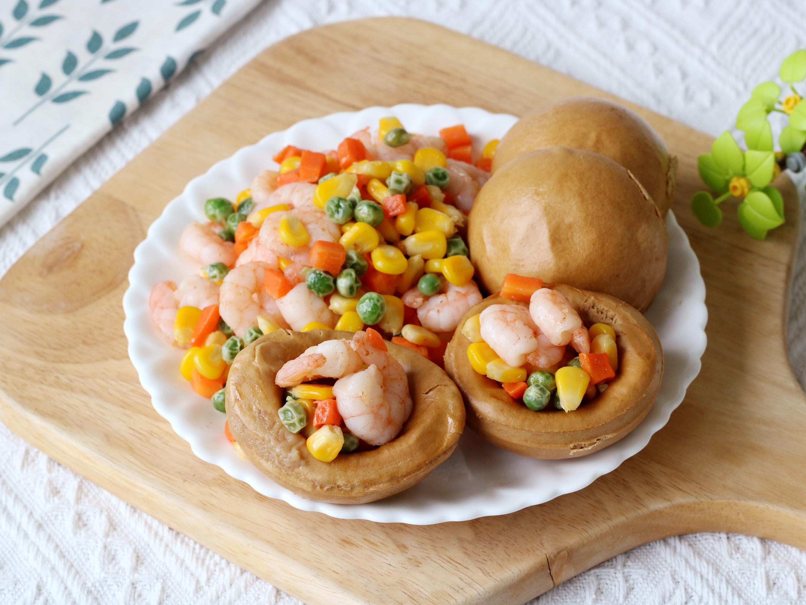 食材:蝦仁、玉米、胡蘿蔔、豌豆、料酒、食用油、鹽、窩窩饅頭
