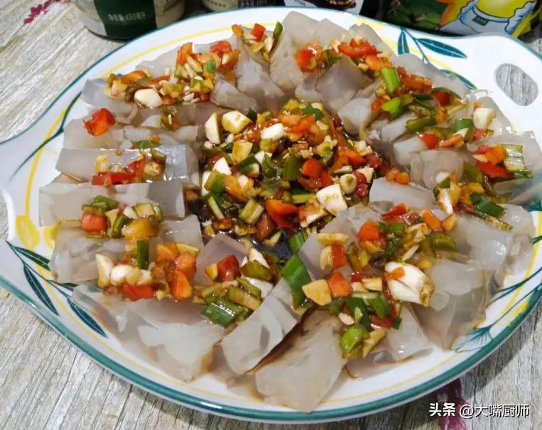 3、把豬皮連湯倒入容器裏,晾涼後放入冰箱裏冷藏一晚就可以了,脫模後切成小塊。碗里加入蔥花、蒜末、小米椒圈,潑上熱油炸香,加入生抽、蠔油、香油、香油,蘸着喫特別香。