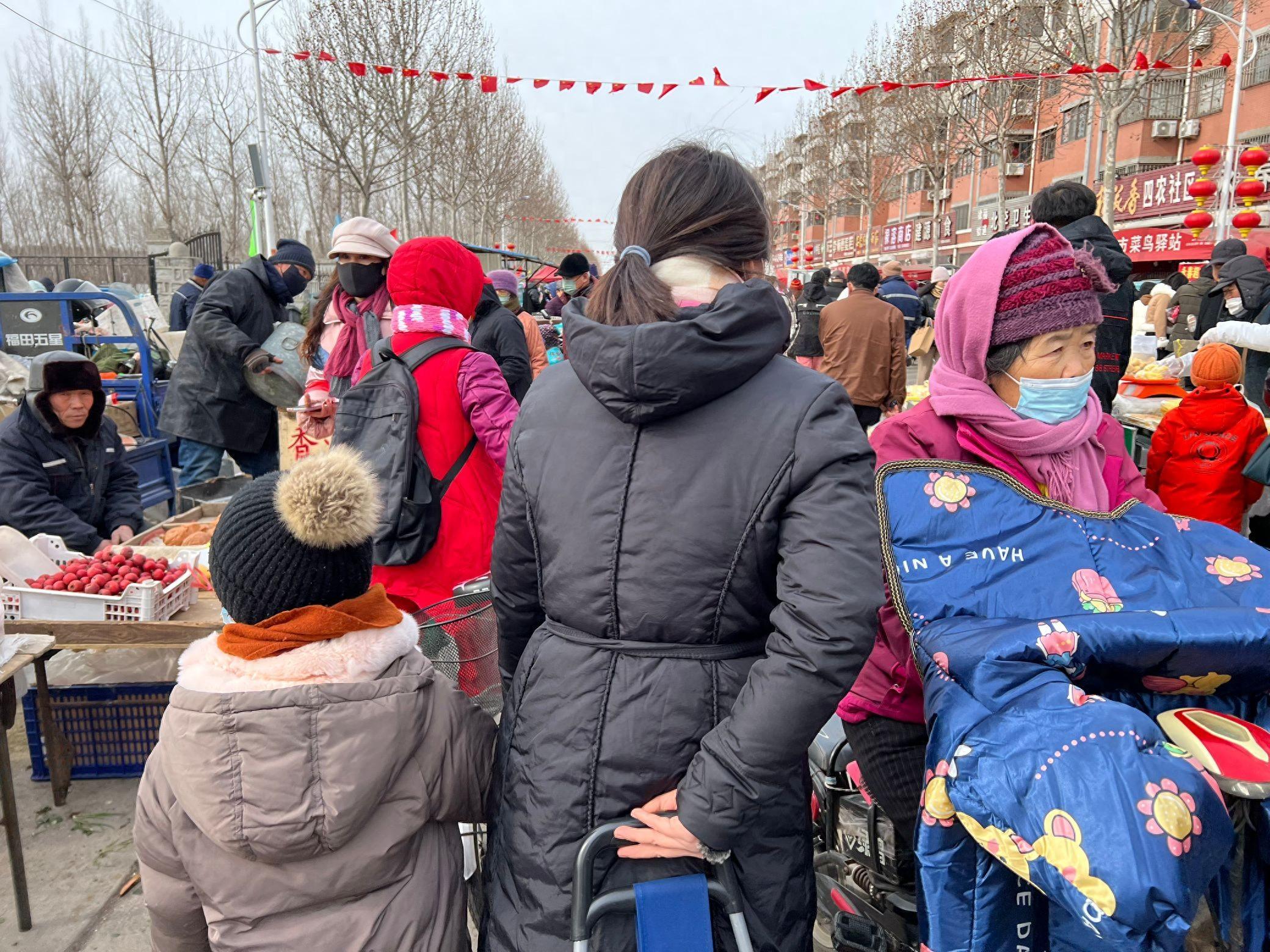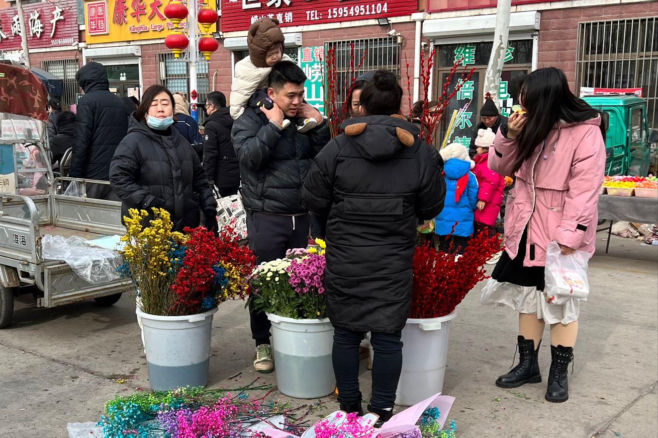 集市上賣迎春花的還真不少呢,這位爸爸扛着兒子,一家三口其樂融融,臘月裏趕大集要的就是一個氛圍感,不管買啥東西,主打的就是一個高興。