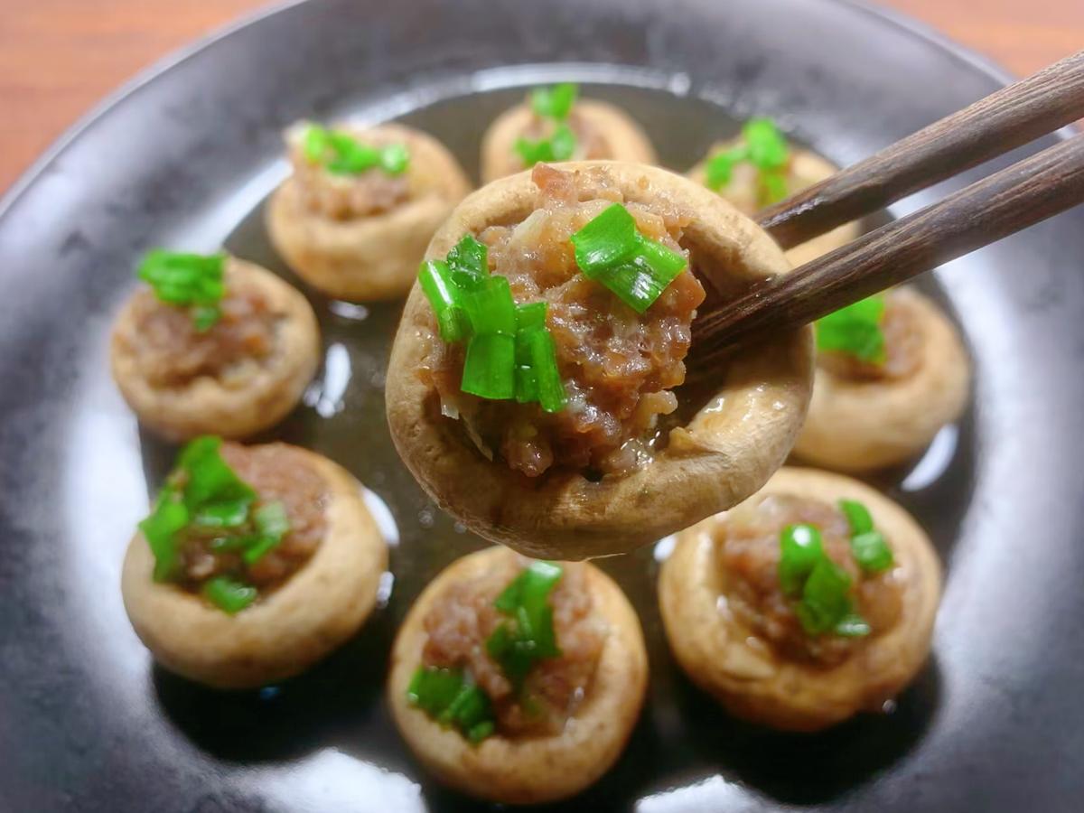 3、接下來用筷子夾適量牛肉放入口蘑內,肉餡量要足一些,因爲牛肉蒸熟後會塌陷,放滿牛肉的口蘑整齊地擺放在盤內。