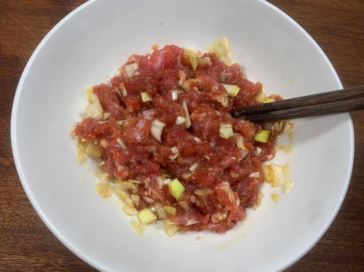 2、取一塊牛肉,把裏面白色的筋去掉,切成小塊後再改刀剁成牛肉泥,剁出來的肉餡比絞肉機絞的要好喫一些。把牛肉餡放入碗內,倒入一小勺料酒去除腥味、再放少許生抽、老抽、香油、鹽和大蔥末,用筷子充分攪拌均勻。