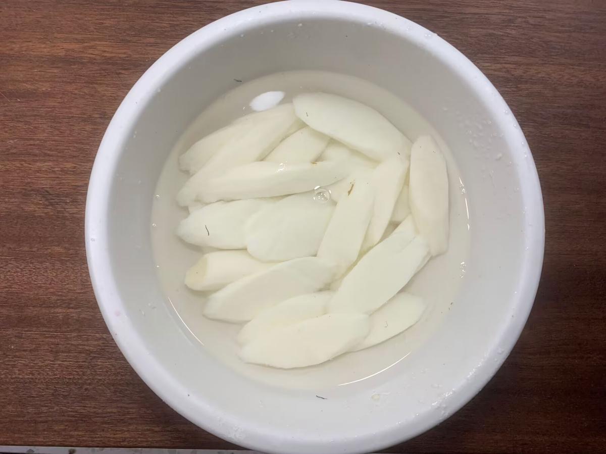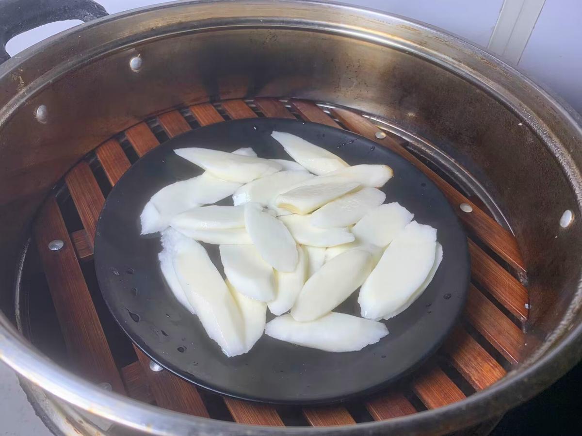 2、鐵棍山藥一根,戴上一次性手套削去外皮,改刀切成薄片,把山藥片放入鍋內蒸熟,大概蒸5分鐘就可以,蒸熟的山藥用冷水洗一下表面的黏液。