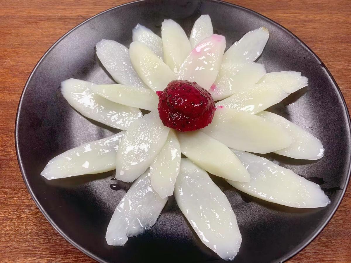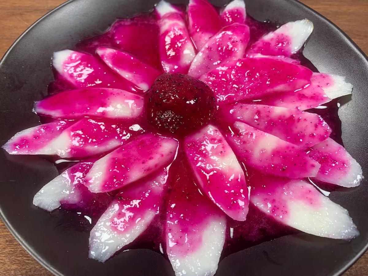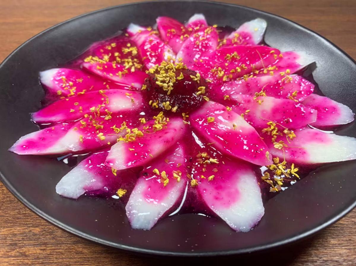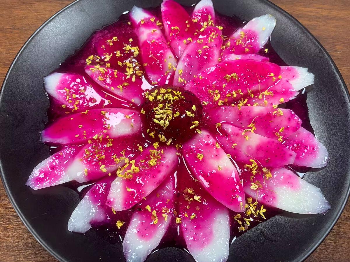 端上桌之前點綴一些桂花,這樣一盤簡單好看又好喫的火龍果胭脂桂花山藥就做好了,軟糯清香,入口即化,鮮甜可口,大人孩子都愛喫,特別解油膩。臘月三十除夕年夜飯,這道“吉祥菜:花開富貴”端上桌,幸福吉祥過大年。這個造型是不是特別適合年夜飯?快收藏哦。
