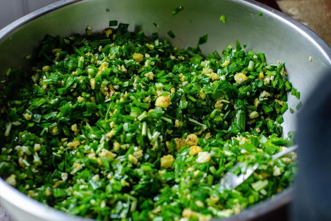 3、接下來的步驟,很多人都是直接把這些東西混合,然後加入調料來調餡兒了,是不是?實際上是不對的,這樣韭菜遇到鹽,就特別容易出水,往往包的時候餡料裏一攤水,特別難包。