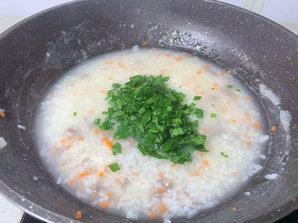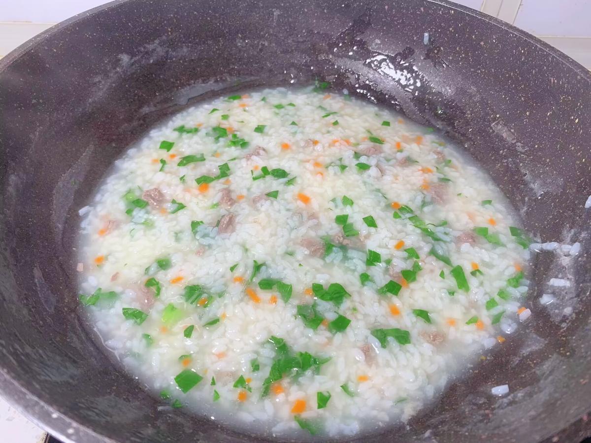 4、牛肉白米粥煮到粘稠後,放入胡蘿蔔碎,煮10分鐘,再放入白菜碎,白菜一定要最後放,否則會煮爛。