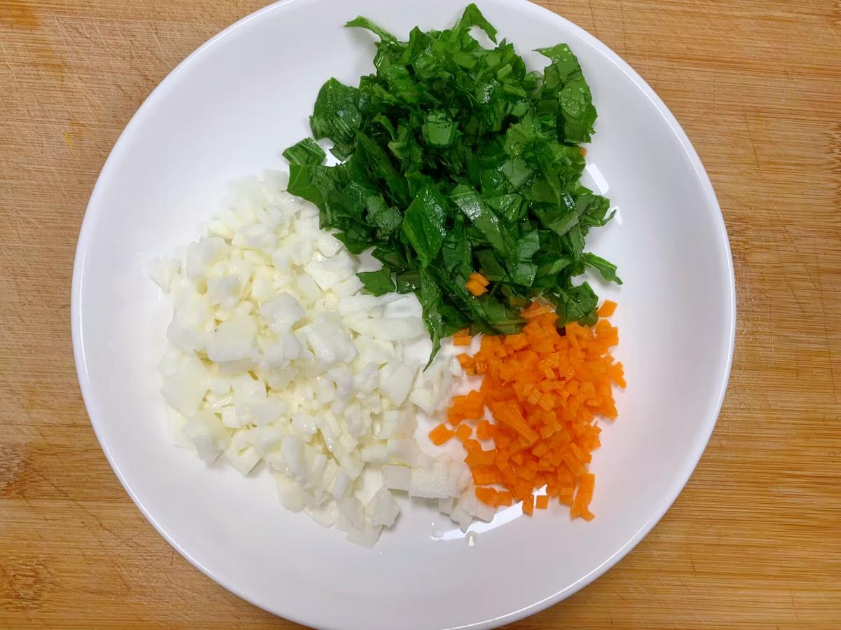 具體做法:1、首先把所有搭配的蔬菜準備好,配菜可以隨意放,家人喜歡喫即可。準備一小塊山藥,削去外皮後,剁成山藥碎;再取一棵小白菜,只用葉子,洗乾淨後切碎;胡蘿蔔去皮剁成碎粒;接下來就是準備少許的牛肉,牛肉要選用瘦肉,不要選牛腩,把牛肉切成小粒後,洗乾淨裏面的血水,攥幹水分用適量胡椒粉、料酒和玉米澱粉,拌均勻醃上10分鐘。