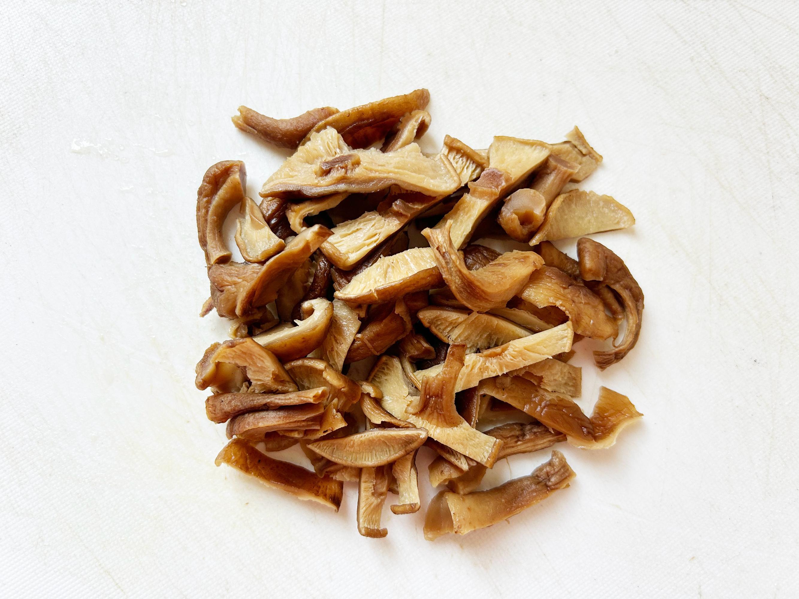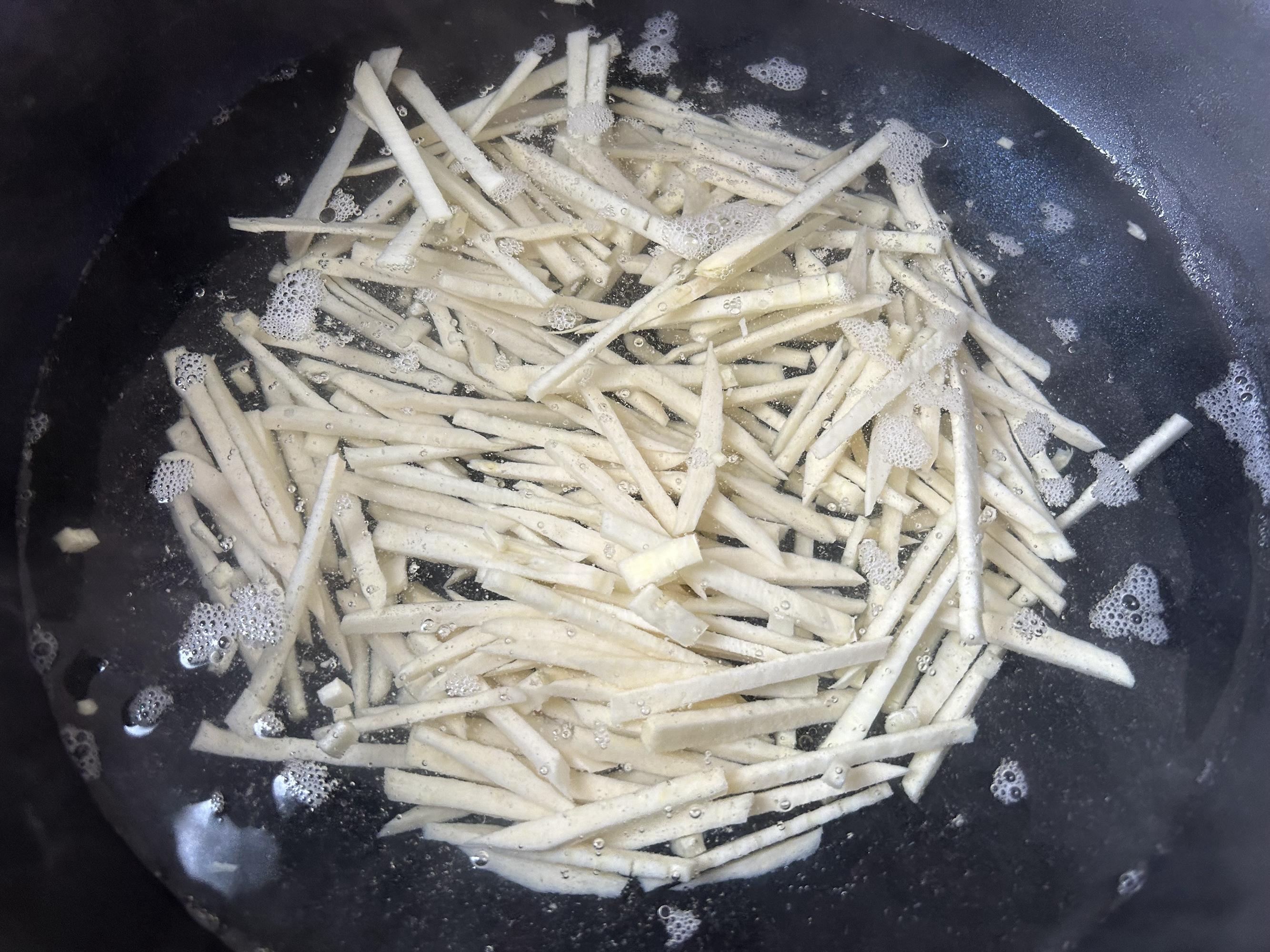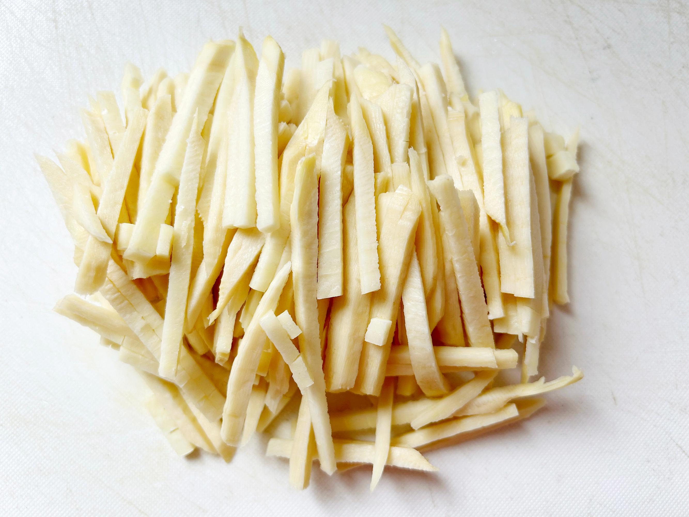 冬筍剝殼,切掉老的根部,切成薄片再改刀切成絲。