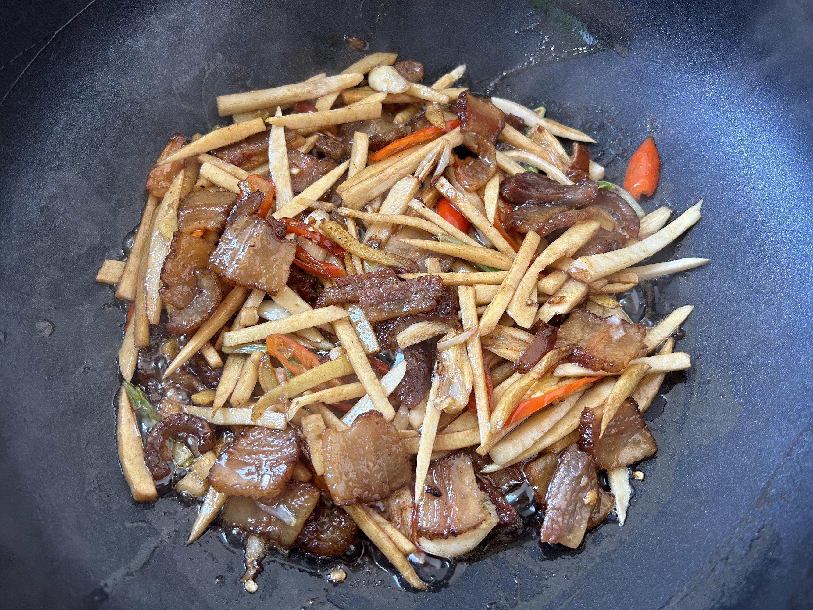 加入焯過水的冬筍,翻炒到熟透,加適量的生抽翻炒到微微上色。