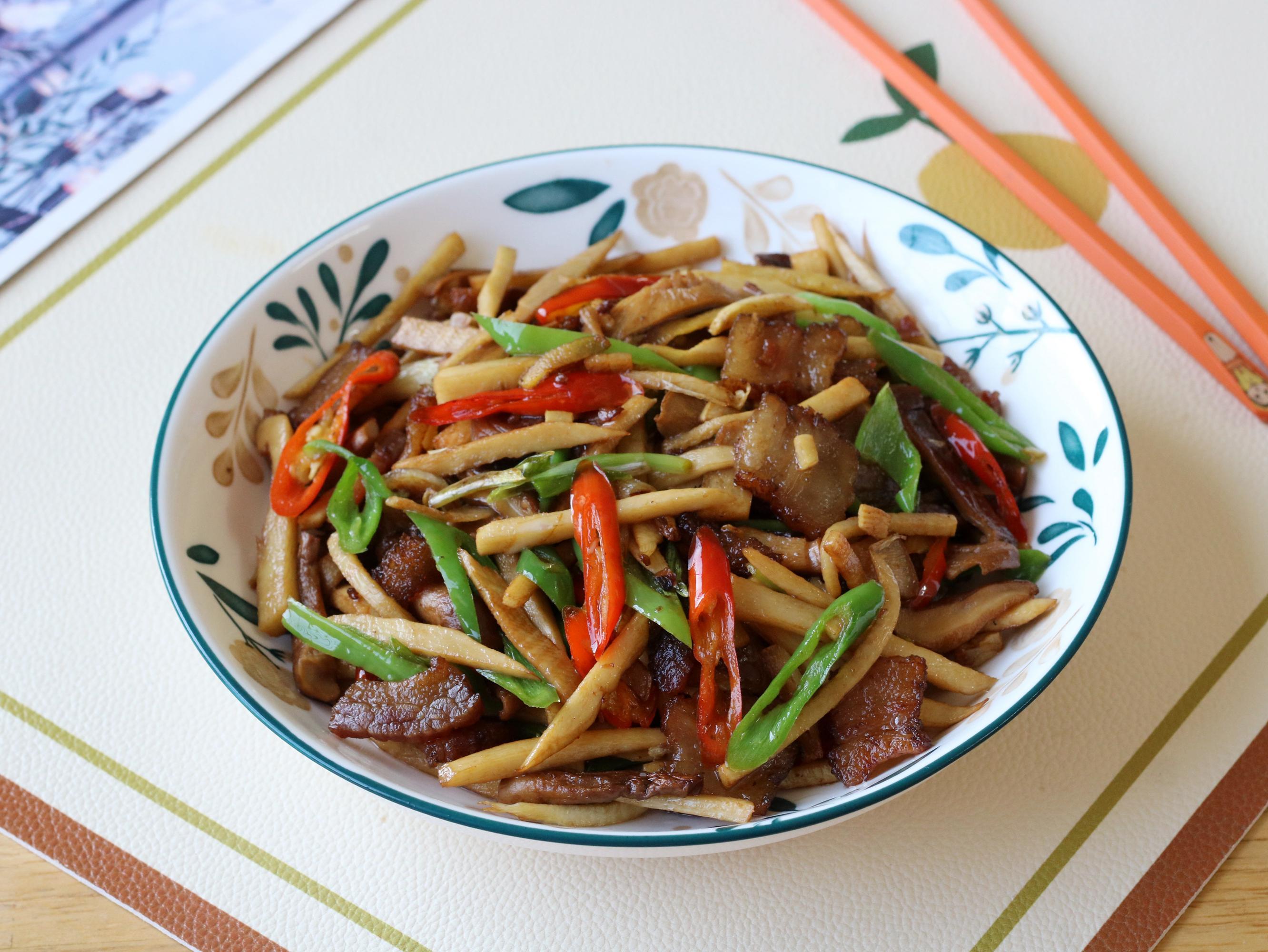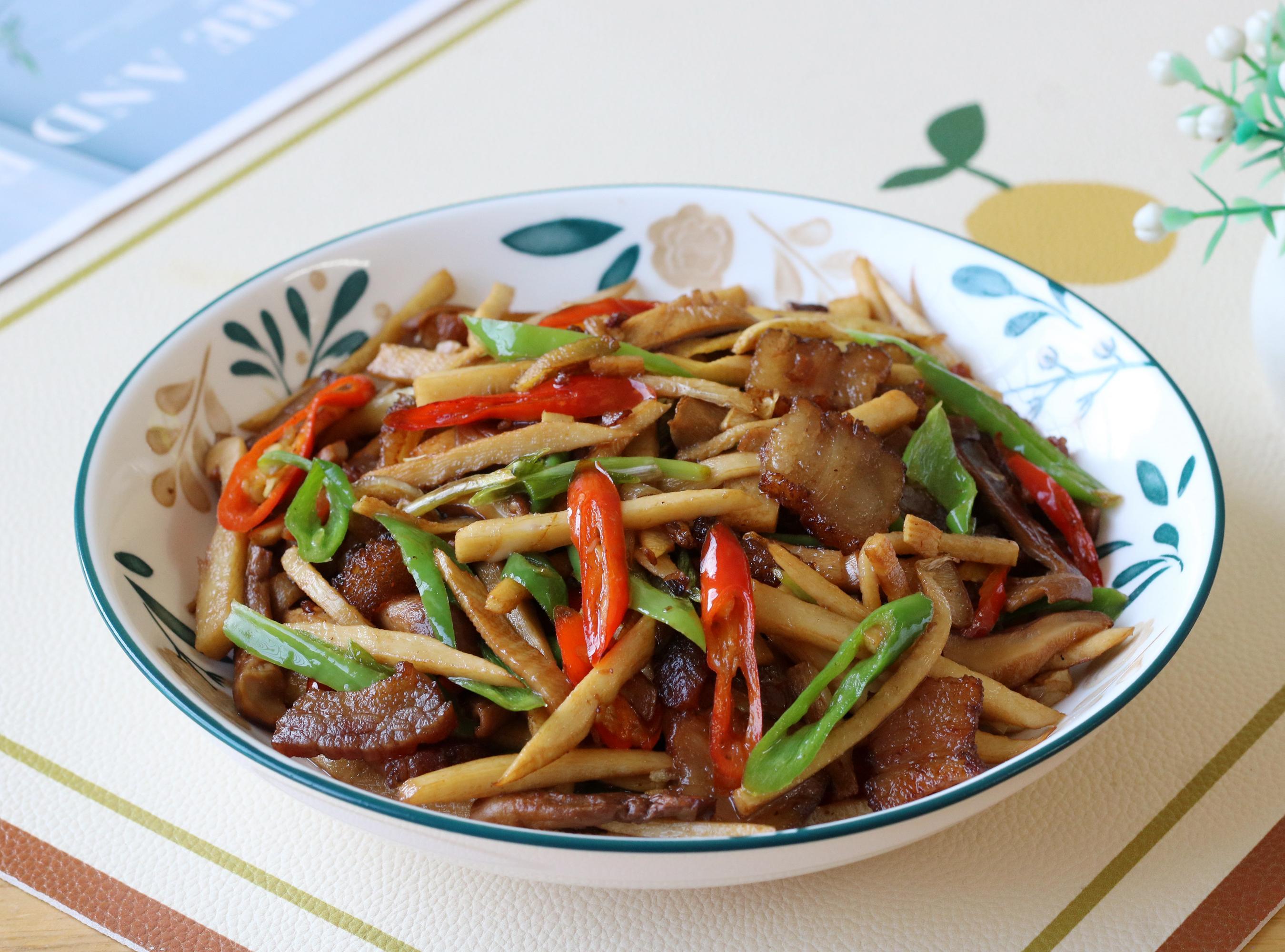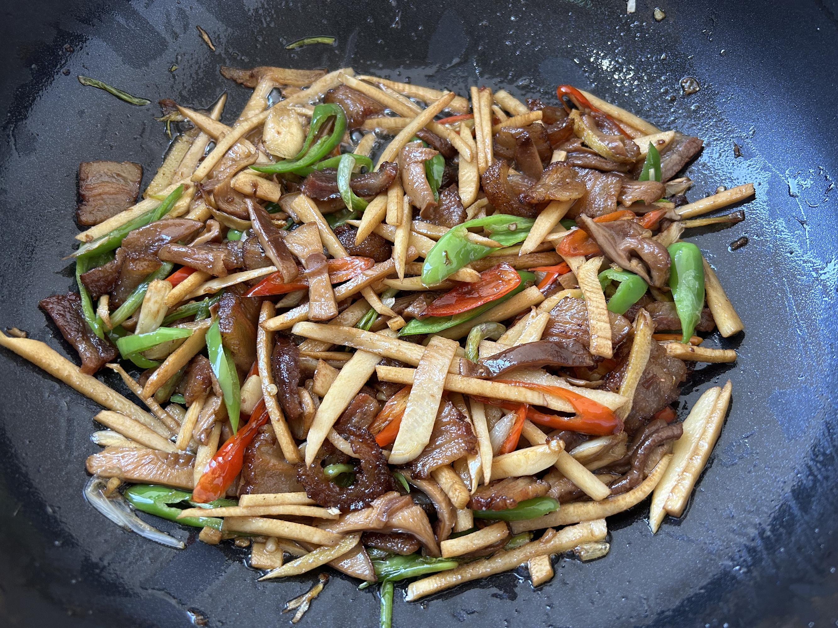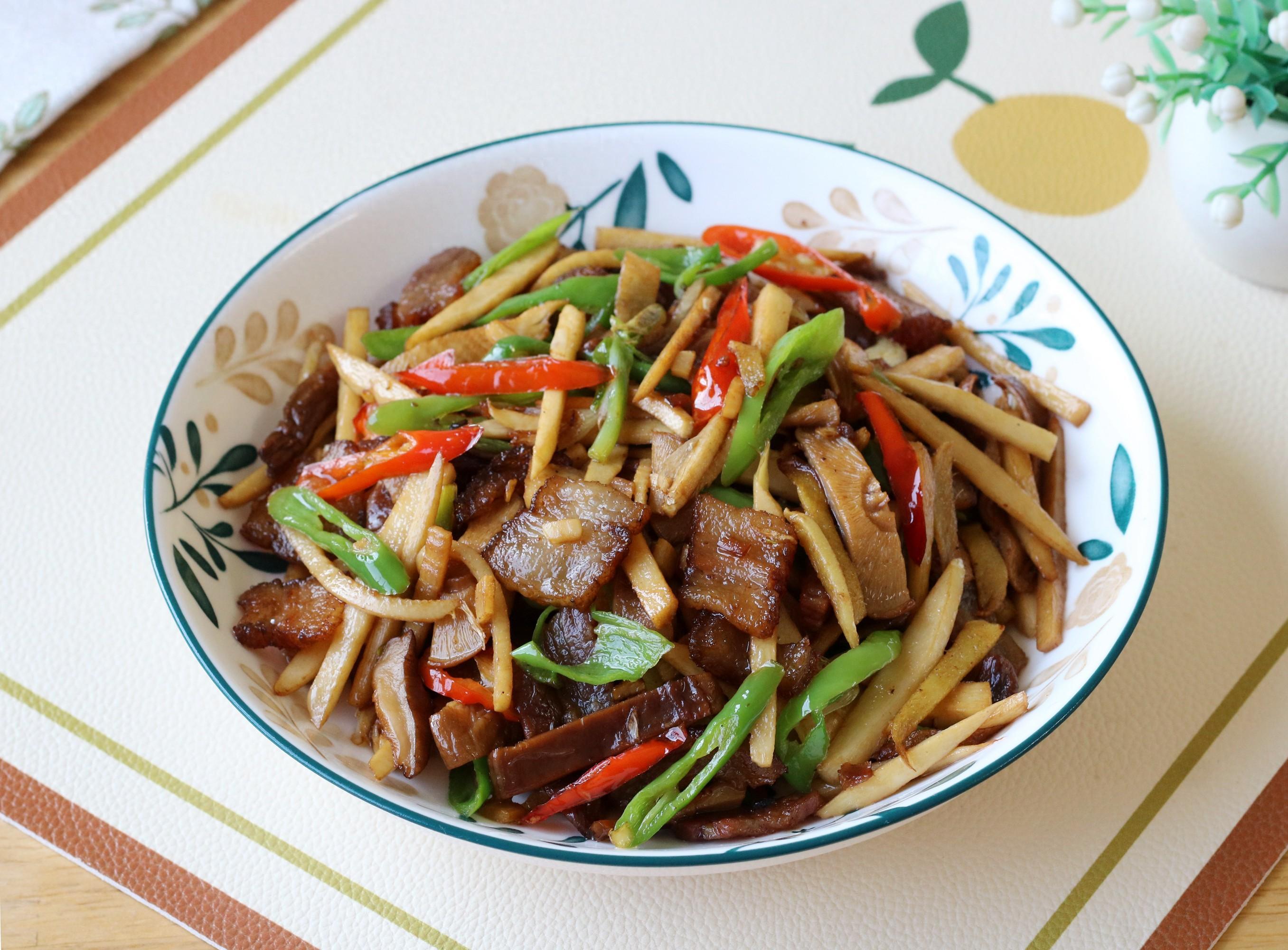 加入香菇翻炒2分鐘,加入青椒翻炒斷生,加適量的鹽調味,一道營養好喫的臘肉炒冬筍絲就做好了。