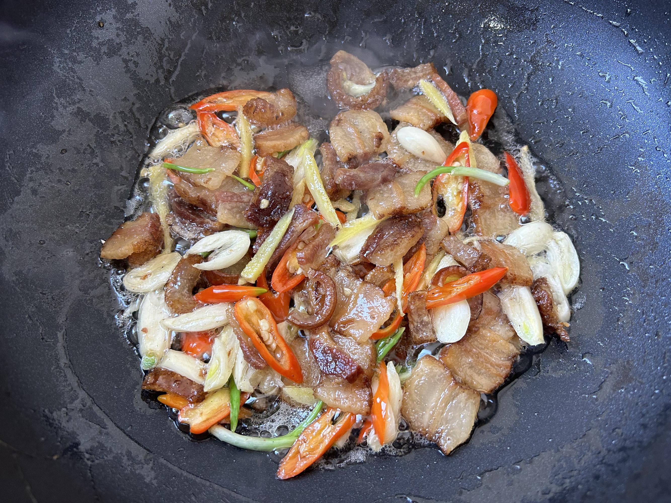 熱鍋放油,放入切好的臘肉煎出油脂,放入姜蒜和紅辣椒翻炒出香味。