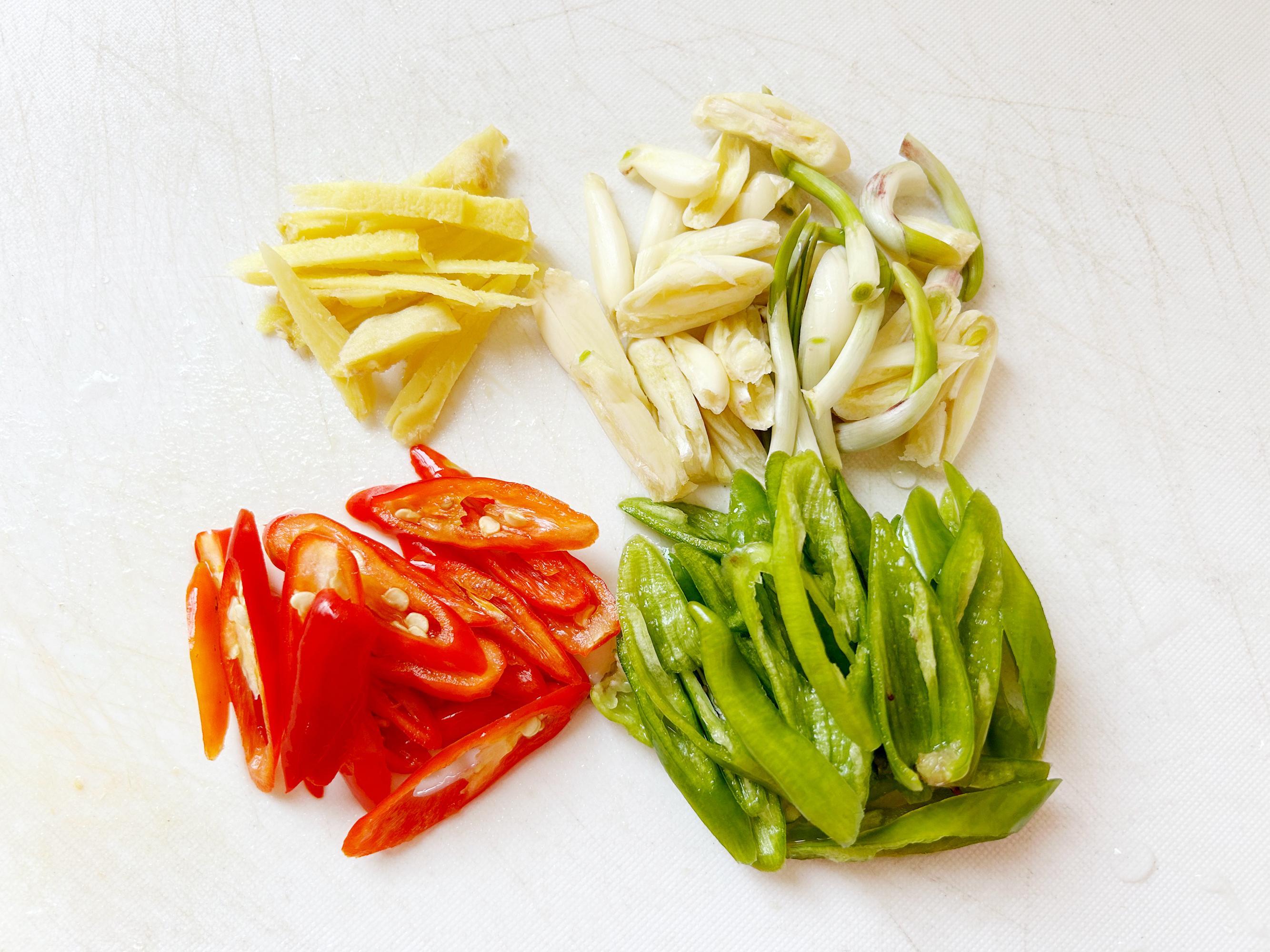 生薑去皮切絲,大蒜去皮切小塊,青椒切長段,紅辣椒切絲。