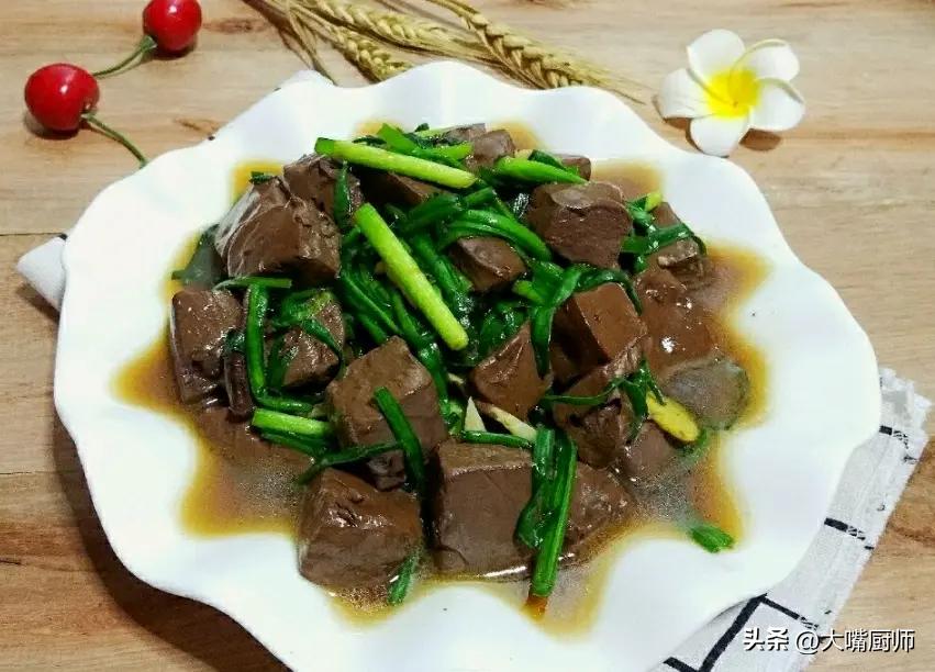 2、起鍋加油燒熱,放入姜蒜末爆香,倒入鴨血翻炒一會兒,加入適量食鹽、料酒、醬油、白糖調味,加2勺水煮1分鐘,倒入韭菜段翻炒一會兒,炒軟後即可出鍋。