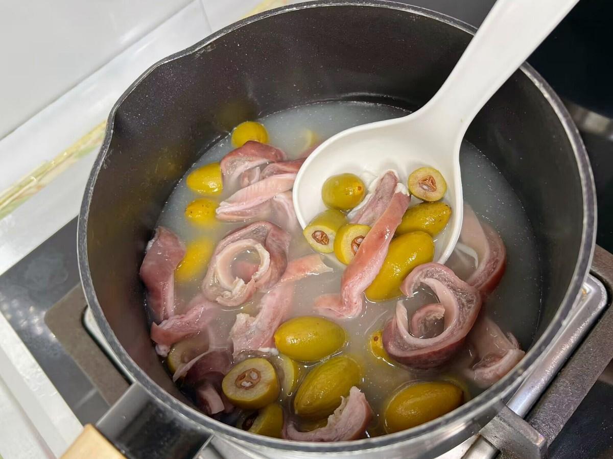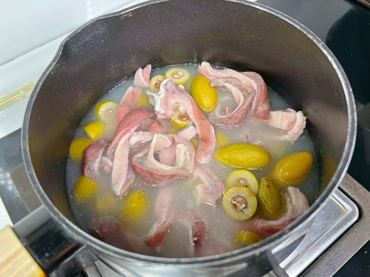 4、把切好的橄欖和豬肚絲一塊倒入鍋中,再往裏倒入純淨水,因爲主要就是喝湯,所以水可以適量多加些,大火燒開後,轉小火繼續煮30分鐘。燉的過程不需要加其它調味品,湯原汁原味才最鮮美。