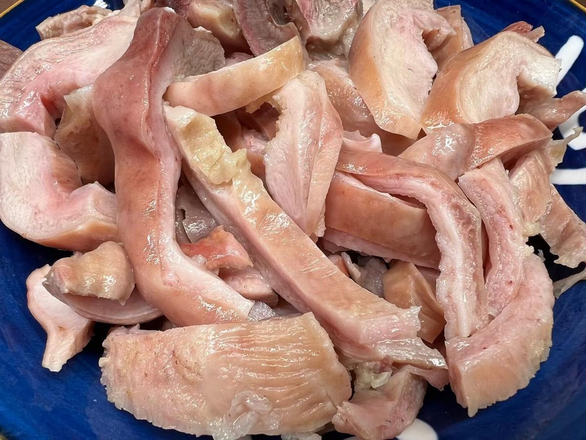3、洗淨後的豬肚不需要焯水,直接放進籠屜中,再放幾片薑片去腥,然後冷水上鍋蒸三十分鐘左右,等用筷子插一下能輕鬆插透就可以出鍋了。因爲豬肚不容易燉爛,這樣提前蒸一下的話,再煮湯就比較容易熟透了。等豬肚不燙手後切成絲備用。