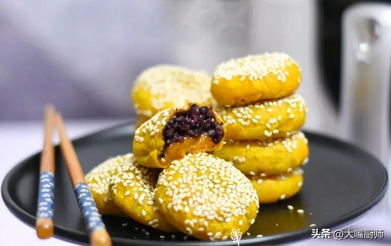 3、用南瓜麪皮包入一勺黑米,慢慢收口然後搓圓,再壓成小餅,表面粘上黑芝麻。空氣炸鍋130℃預熱,放入黑米南瓜餅烤20分鐘,就可以出鍋了。