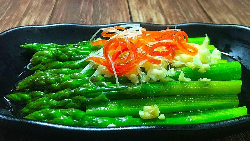 2、鍋裏水燒開,加一點食用油,倒入蘆筍焯水20秒左右,即可撈起過涼水,熱鍋加一點清水,加適量的生抽、白糖,化開後淋在蘆筍上,再倒入蒜末,紅椒絲,最後澆上熱油,激發出蒜香味。蒜香蘆筍就做好了。