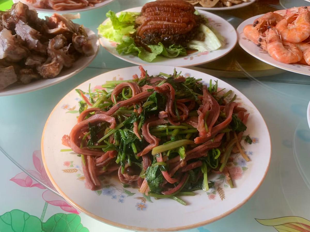 蓮藕這道菜可被爸爸炒翻車了,一上桌就被大姐夫數落上了,不僅炒的顏色發黑,而且喫起來口感發綿。最後一道菜是舌根,也是壓軸菜,更是這桌子最受歡迎的下酒菜。