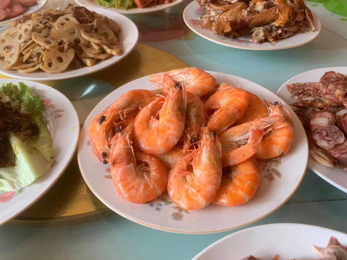 水煮大蝦是孩子們喜歡喫的海鮮,也是爸爸提早備好的年貨,煮熟後直接剝着喫,鮮味十足。還有爸爸親手灌的臘腸,今年豬肉賊便宜,我們當地養殖的豬肉才12元一斤,爸爸一下子灌了30斤的臘腸,鹹香味俱全,超好喫,不管是蘸料汁還是炒着喫,都賊香。
