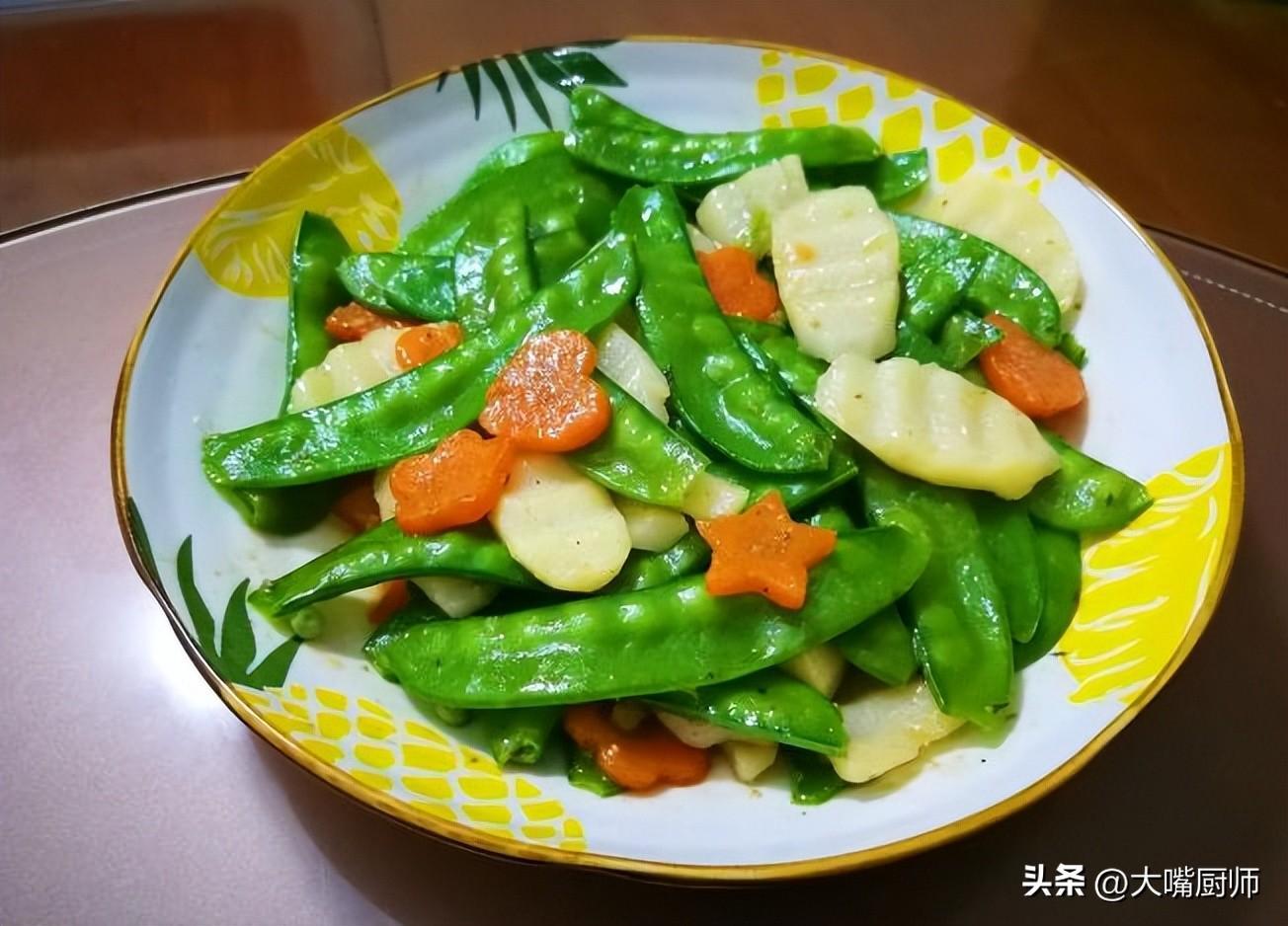 另起鍋加油,燒熱後放入山藥、胡蘿蔔、荷蘭豆翻炒,再倒入料汁翻炒收汁,就可以出鍋了。芡汁要薄點,不要太濃厚。