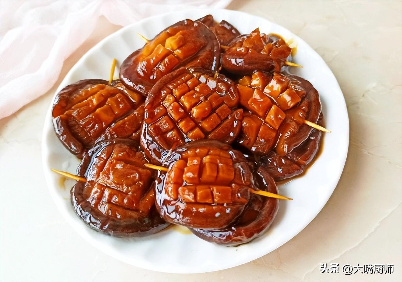鍋內加水,煮開後放入香菇,煮三分鐘撈出,再擠掉水分,並用牙籤穿起來,讓內部拱起來,更有鮑魚的感覺。
