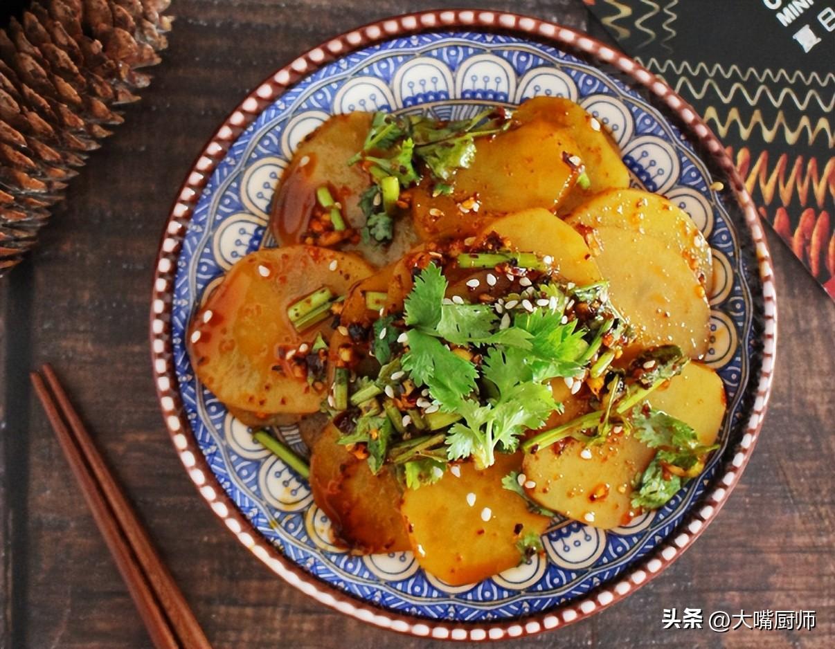 最後將土豆片、香菜放在一起,再倒入料汁攪拌均勻,就可以裝盤了。我每次做這道菜,都最先光盤,你也試試。